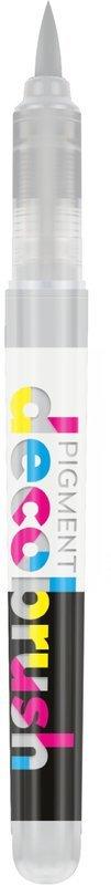 PIGMENT DECO BRUSH - Brush Marker Pigment DecoBrush Marker enthalten 2,4 ml ungiftige Farbe auf Basis organischer Pigmente. Sie werden in der sogenannten "free-ink" Technologie hergestellt, so dass die Farbintensität bis zum letzten Tropfen unverändert bleibt und die Tintenausgabe sich laufend kontrollieren lässt. Pigment DecoBrush Marker können auf Papier, Metall, Glas, Kunststoff, Holz, Textilien und vielen anderen Materialien verwendet werden. Auch auf dunklen Oberflächen erzeugen die Marker durch ihre satten, matten Farben einen grossartigen Effekt. Auf dünnem Papier schlägt die Farbe nicht durch. Der Gebrauch von Pigment DecoBrush Markern ähnelt jenem von Acrylfarben, ist jedoch in einem praktischen Marker mit einer flexiblen, pinselförmigen Nylonspitze verpackt. Die Farben können untereinander so lange vermischt werden, bis sie vollständig getrocknet sind. Die Trocknungszeit der Farbe hängt von der Oberfläche ab, auf welcher sie verwendet wird. Mit handelsüblichen Lacken, durch Bügeln oder in den Backofen stellen können die Farben fixiert werden