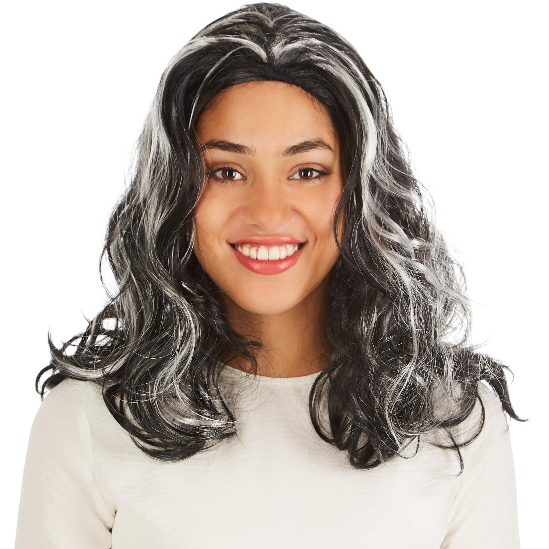 Die Perücke Vampirin Lilith hat schönes schwarzes, gelocktes Kunsthaar mit helleren Strähnen im vorderen Bereich. Haarlänge ca. 65 cm, Material: 100 % Polyester.