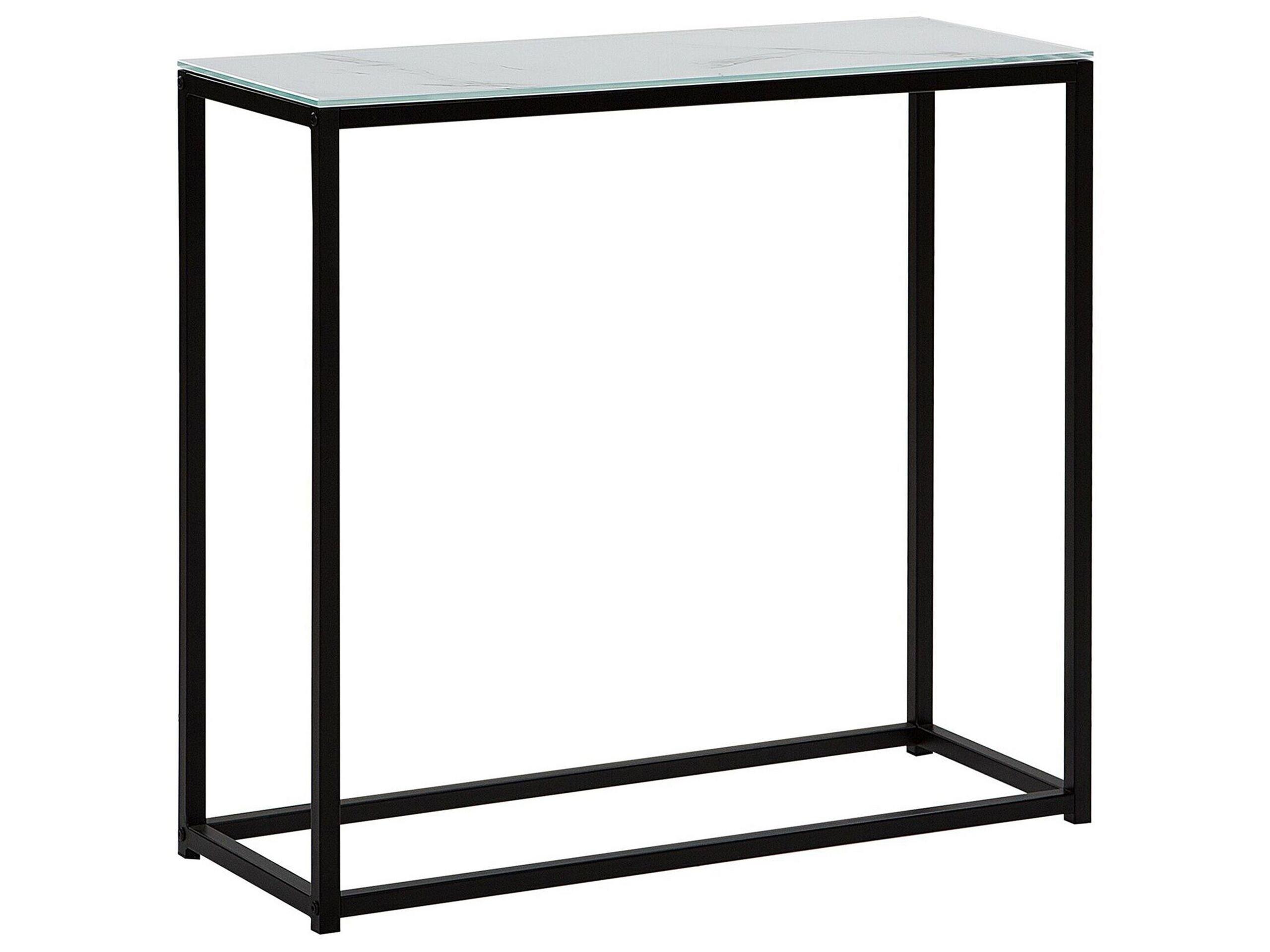 Rechteckiger Konsolentisch mit luxuriösem Marmor-Effekt. Dank der Material- und Farbkombination verleiht dieser Konsolentisch Ihrer Einrichtung eine einzigartige, elegante Note. Die pulverbeschichteten, schwarzen Metallstreben des Untergestells sind miteinander verbunden und sorgen dabei für zusätzliche Standfestigkeit. Die Tischplatte aus hochwertigem Sicherheitsglas in Weiss bietet genug Platz für dekorative Accessoires, Ihre Lieblingsbücher, diverse Schlüssel oder Schmuck.