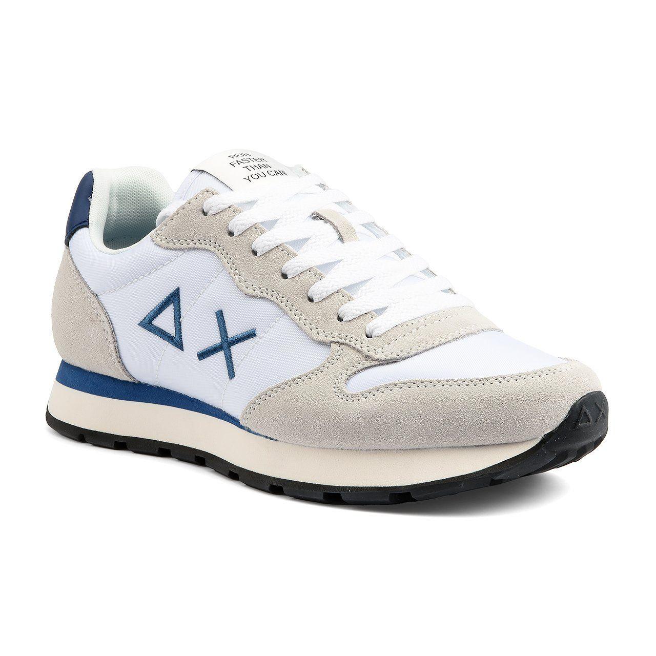 Das TOM SOLID Paar zeichnet sich durch sein einzigartiges Design aus, das Samtleder und Textil kombiniert. Die Hauptfarbe ist Weiß, mit Akzenten in Beige für die Seitenwände und die Ferse. Blaue Akzente sind ebenfalls vorhanden, darunter ein dreieckiges Logo in der Nähe der Schnürsenkel und ein kleines "AX" in Dunkelblau an der Seite der Ferse. Marineblaue Details sind auch um den Kragen und die Zunge herum vorhanden, wo man "schneller laufen als man kann" lesen kann.