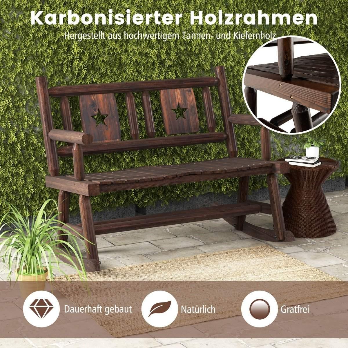 Entdecken Sie die perfekte Mischung aus Komfort und Stil mit unserer wunderschön gefertigten Patio-Schaukelbank für zwei Personen. Dieses elegante Stück wurde entwickelt, um Ihren Außenbereich in einen ruhigen Rückzugsort zu verwandeln. Mit seiner soliden und stabilen Schaukelbasis bietet er eine sanfte Schaukelbewegung von 22° und lindert so effektiv Stress und Druck. Diese Schaukelbank besteht aus hochwertigem Tannen- und Kiefernholz mit Karbonisierungsbehandlung und ist für den langfristigen Einsatz im Freien ausgelegt. Sein ergonomischer und breiter Sitz, gepaart mit einer um 100° geneigten Rückenlehne, sorgt für optimalen Komfort für Sie und Ihre Lieben. Die rustikale braune Oberfläche und die eleganten Muster auf der Rückenlehne machen diesen Schaukelstuhl für zwei Personen zu einer atemberaubenden Ergänzung für Ihren Garten, Ihre Veranda oder Ihren Hinterhof.
