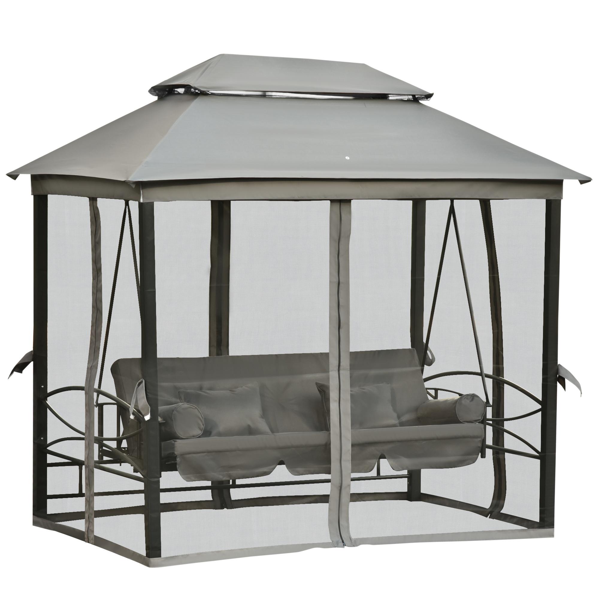 Holen Sie sich den Traum von 1001 Nacht nach Hause! Unsere Luxus-Gartenschaukel lässt keine Wünsche offen. Sitzen Sie auf den komfortablen Schwingliege oder klappen Sie die Lehne mit nur wenigen Handgriffen um, sodass Sie die so entstandene Liegefläche zu einem entspannten Schläfchen einlädt. Sonnendach und Bezüge sind aus wasserabweisendem Polyester gefertigt und die Moskitonetze ringsum schützen Sie vor lästigen Insekten.