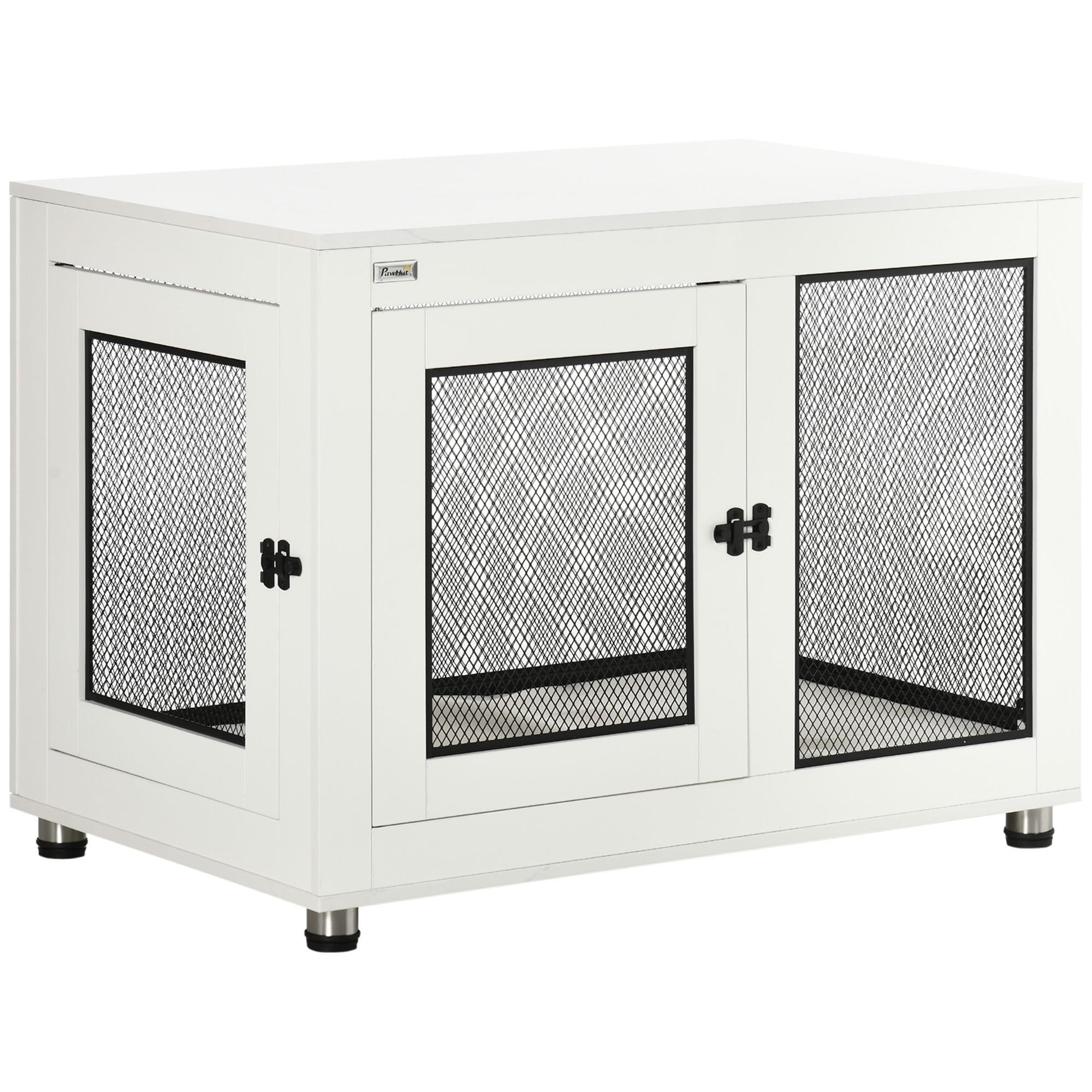 Dieser dekorative Hundekäfig von PawHut bietet Ihren kleinen Schützlingen einen hohen Schlafkomfort durch eine kuschelige, weiche Matte, deren Bezug sich leicht abziehen und in der Waschmaschine reinigen lässt. Die zwei verriegelbaren Türen und das feine Stahlgitter des Hundehauses verhindern, dass die Welpen ausbüchsen und sich in eine gefährliche Situation begeben. So können Ihre Welpen sicher und wohlbehalten heranwachsen.