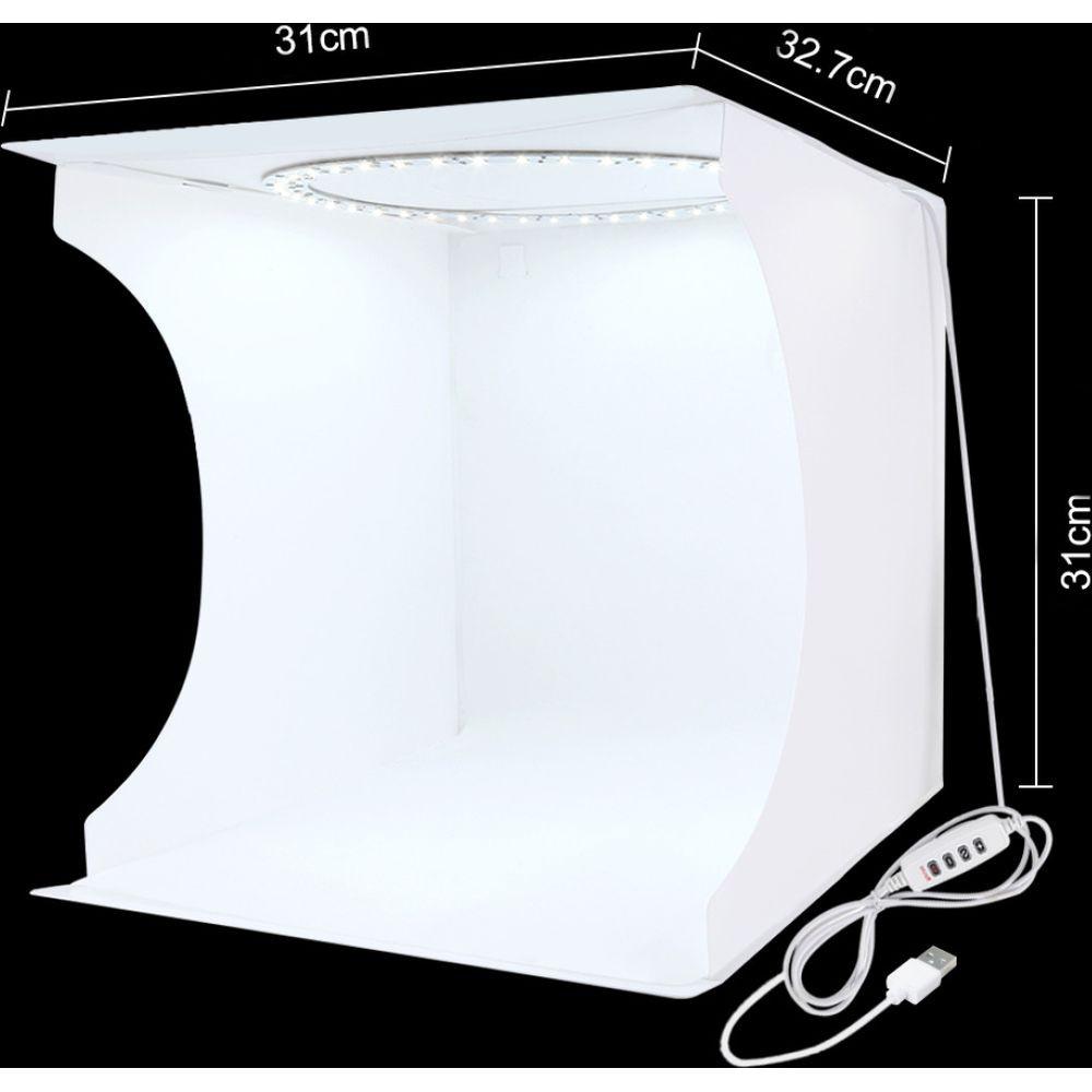 Dieses 30x30x30cm kompakte Mini-Fotostudio mit eingebauter LED Leuchte, ist ideal für das schnelle und einfache Fotografieren von kleineren Gegenständen geeignet. Die aus 128 LED Perlen bestehende integrierte Beleuchtung, sorgt dabei für eine gleichmässige Auslichtung des Objekts. Dazu kann über den am Kabel angebrachten Schalter die Farbtemperatur zwischen 3 verschiedenen Einstellungen angepasst werden. Durch das Klappstruktur Design, kann das Mini-Fotostudio einfach und schnell auf, und abgebaut werden. Sobald das Fotostudio zusammengefaltet wird, ist es kompakt genug, um in der Mitgelieferten überall hin mitgenommen zu werden. Durch die Stromzufuhr über USB, kann das Mini-Fotostudio von Puluz so gut wie überall mit Strom betrieben werden.