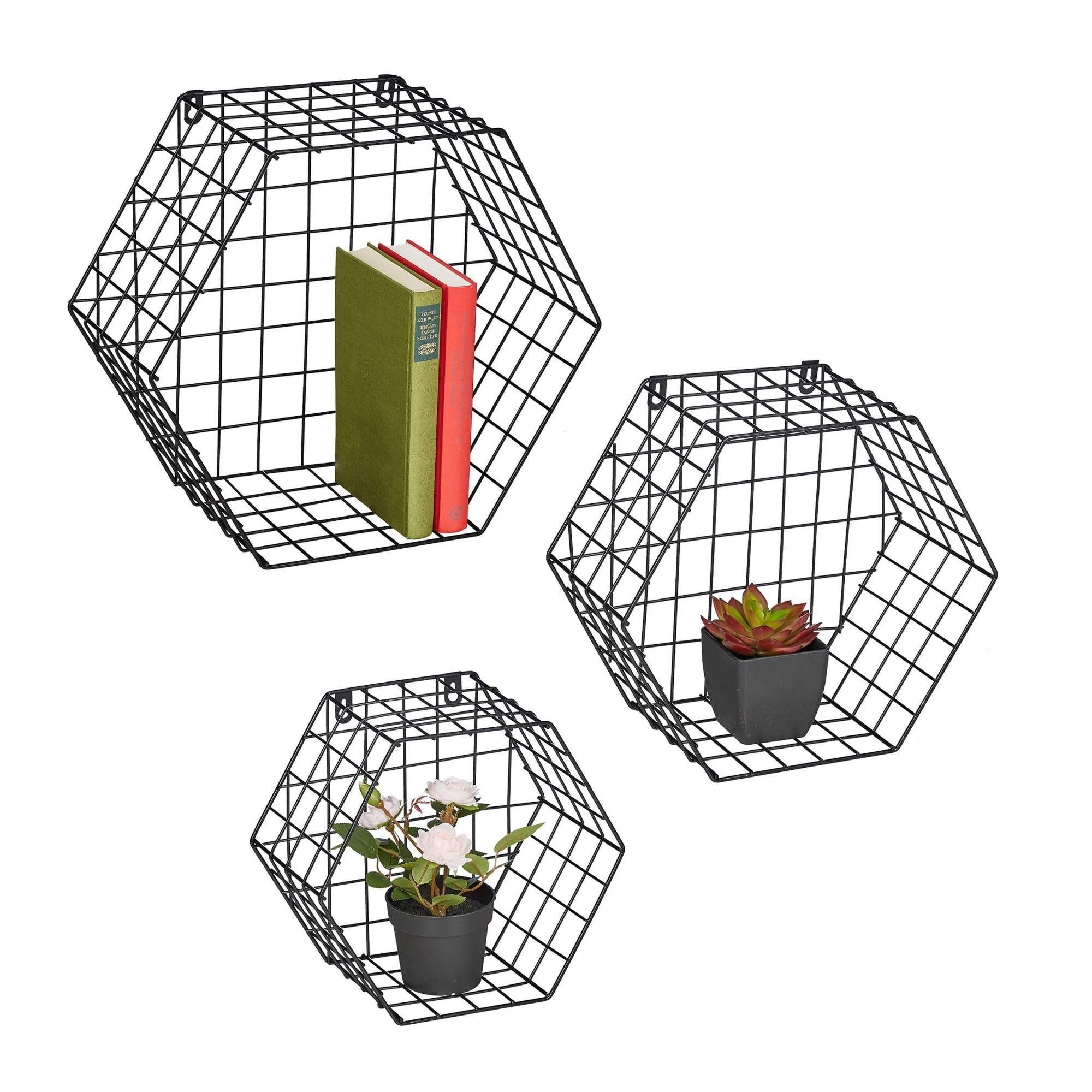 Sechseckige dekorative Wandregale verleihen Ihrem Raum industriellen Charme und eignen sich perfekt für die Präsentation von Pflanzen, Fotos oder Dekoartikeln. Diese schwarzen Regale mit Gitterrahmen werten jeden Raum mühelos auf.