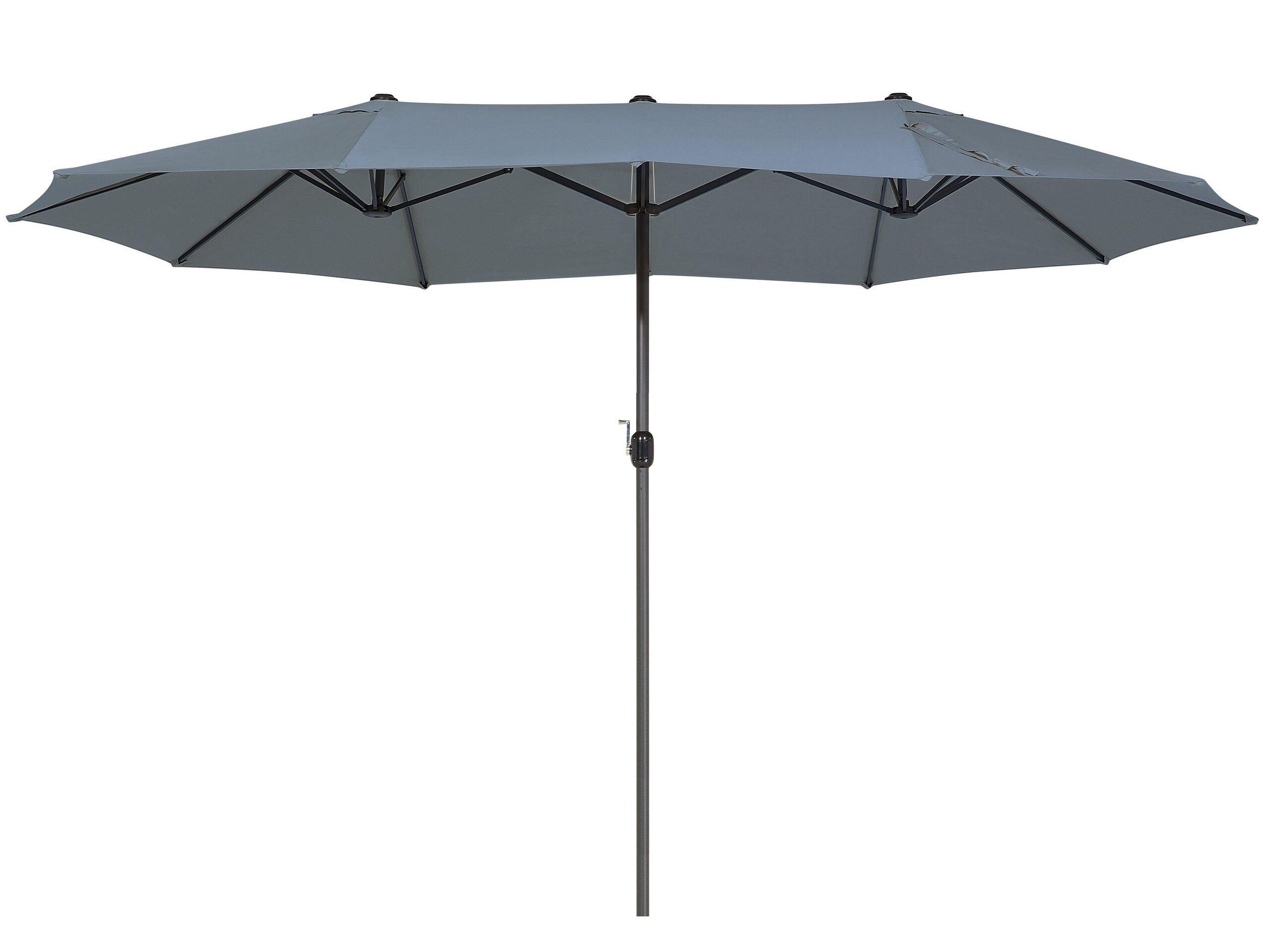 Grosser Sonnenschirm in Anthrazit. Dieser Sonnenschirm in elegantem Dunkelgrau schützt Ihre ganze Familie vor Sonneneinstrahlung. Das Modell besteht aus einem stabilen Mast aus robustem Aluminium und einem doppelten Schirm aus strapazierfähigem und schmutzabweisendem Polyester mit Sonnenschutzfaktor. Die Bespannung kann leichten Regenschauern standhalten, ist abnehmbar und von Hand waschbar. Einfaches Öffnen mittels einer Kurbel und zwei praktische Winddächer für eine hohe Standfestigkeit vervollständigen das Design.