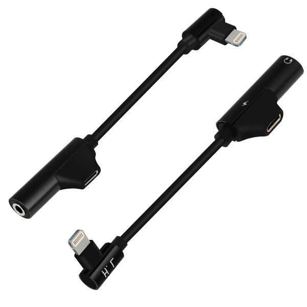 HL092 Audio-& Ladeadapter mit abgewinkeltem Lightning Stecker auf 3,5mm Klinkenanschluss und Lightning Anschluss. Bietet die Möglichkeit kabelgebundene Kopfhörer anzuschließen und es gleichzeitig aufzuladen. 12 cm lang.