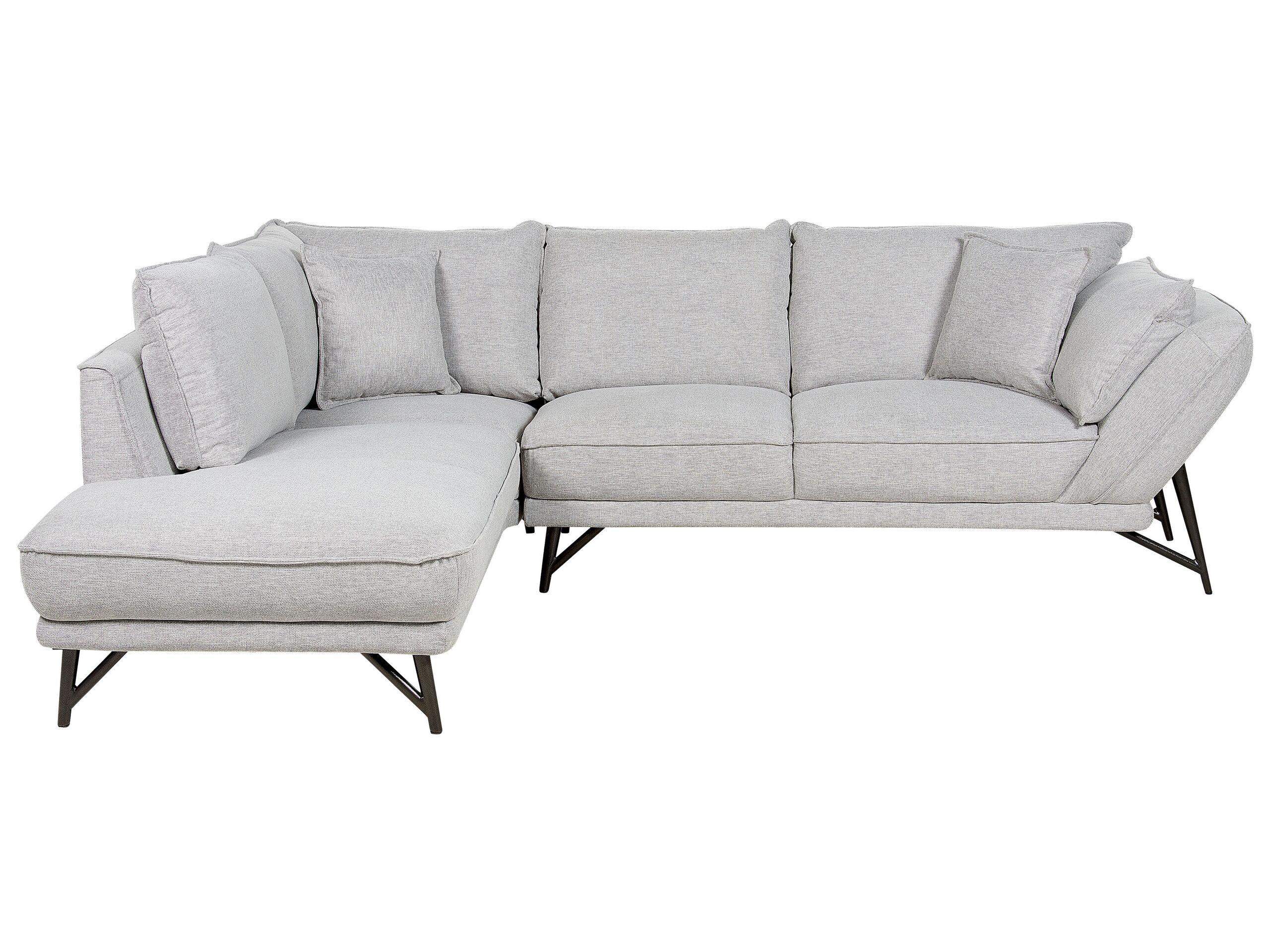 Modern gepolstertes Sofa in L-Form. Machen Sie es sich bequem und geniessen Sie Ihre Freizeit auf einem stilvollen, gepolsterten Ecksofa. Die moderne Ästhetik macht es zum Mittelpunkt jedes Wohnraums. Zudem ist das Sofa aus langlebigem Leinenstoff gefertigt. Die zusätzlichen Dekokissen und die aus grossen Kissen bestehende Rückenlehne bieten einen hohen Komfort, während die schwarzen Metallfüsse Stabilität garantieren.