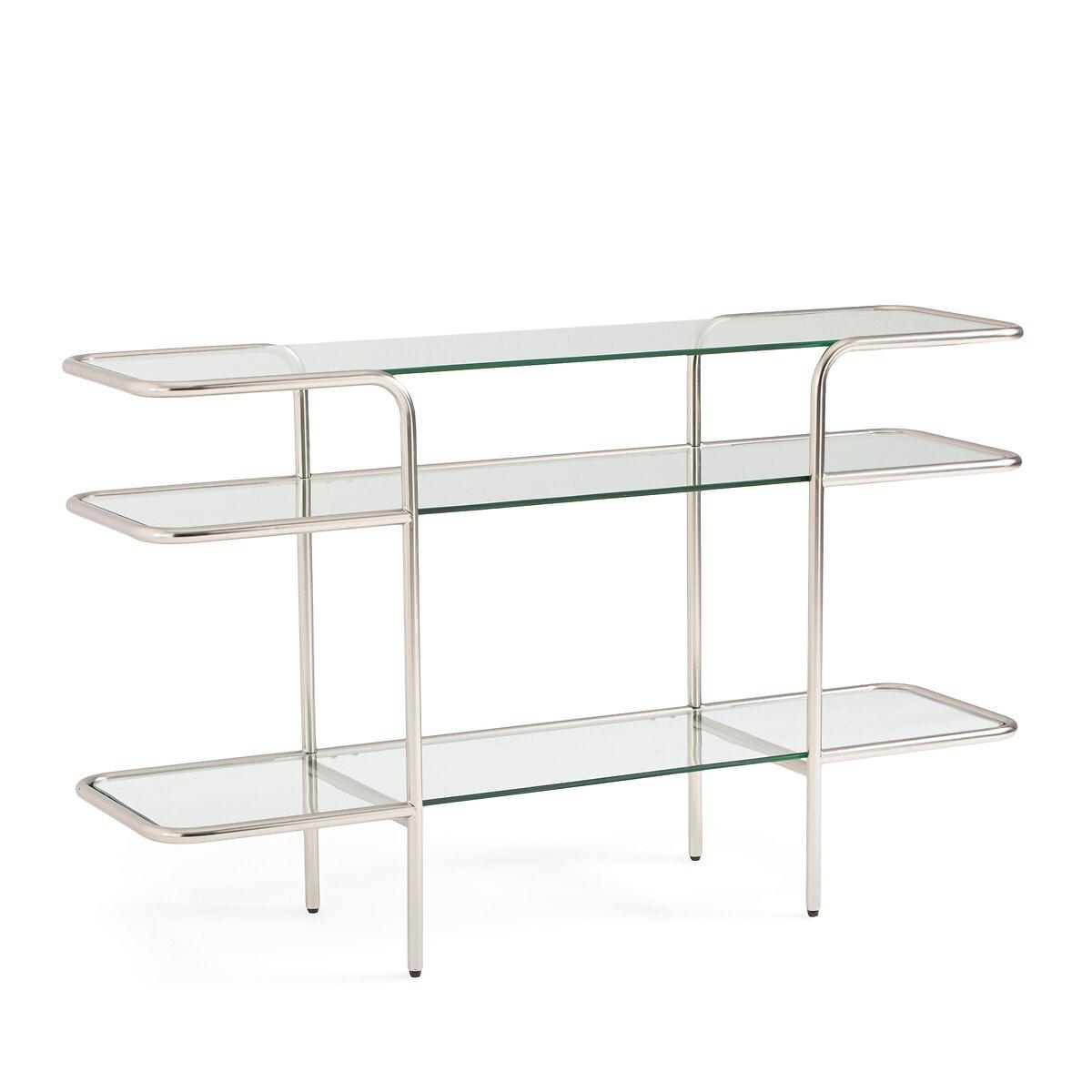 Das mittelgrosse Modell mit den abgerundeten Ecken kann zweifach genutzt werden: Konsole oder kleines Bücherregal. Das Finish in Nickel satiniert, die Verwendung von gehärtetem Glas und das luftige Design sorgen für den wertigen Gesamteindruck. Ein exklusives Design von AM.PM.Beschreibung