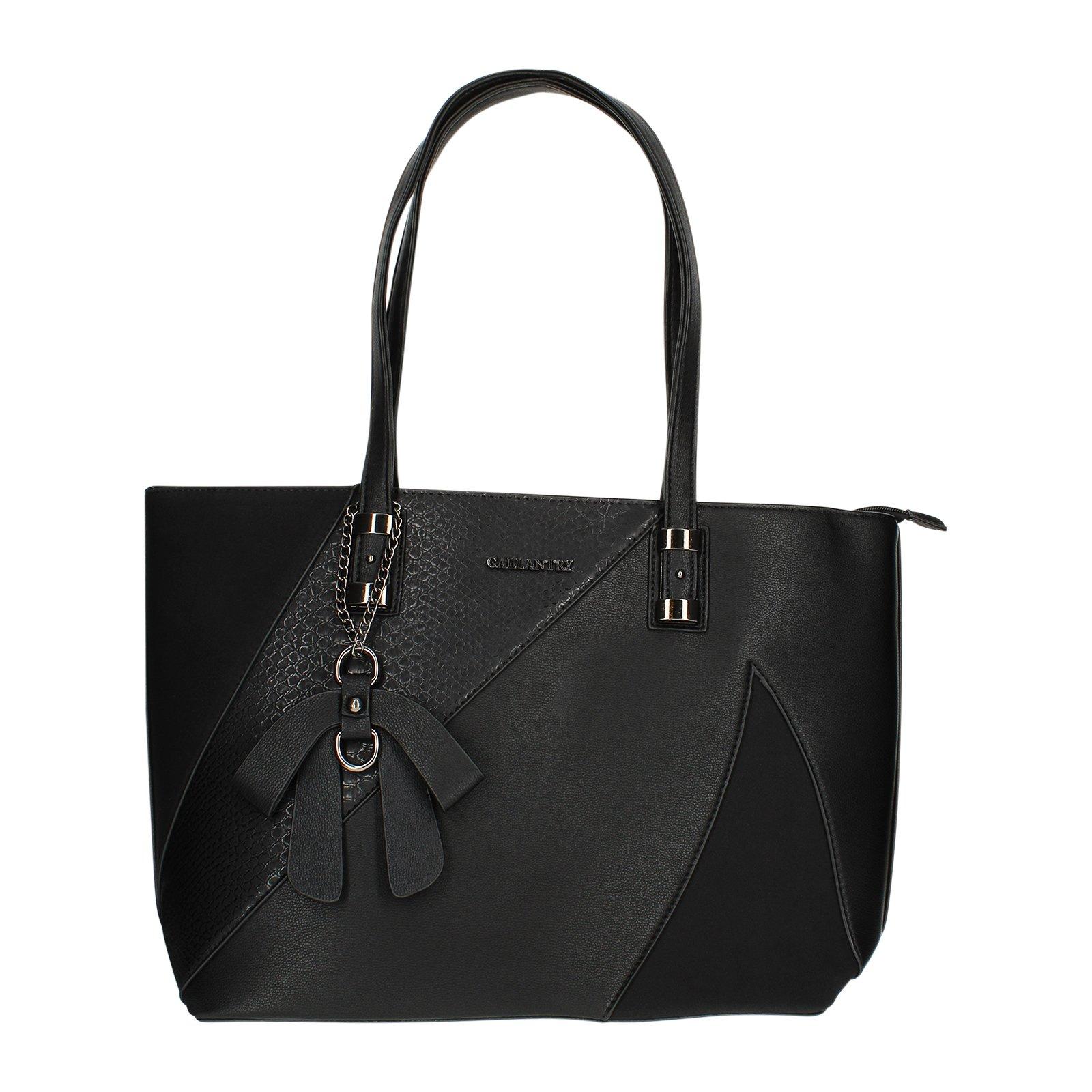 Diese klassische Gallantry Tragetasche ist aus Kunstleder mit Schlangenprint und zwei Wildleder-ähnlichen Teilen gefertigt. Sie verfügt über einen dekorativen Anhänger am Henkel und ein grosses Fach mit kleineren Fächern. Eine kleine Reissverschlusstasche ist ebenfalls enthalten.