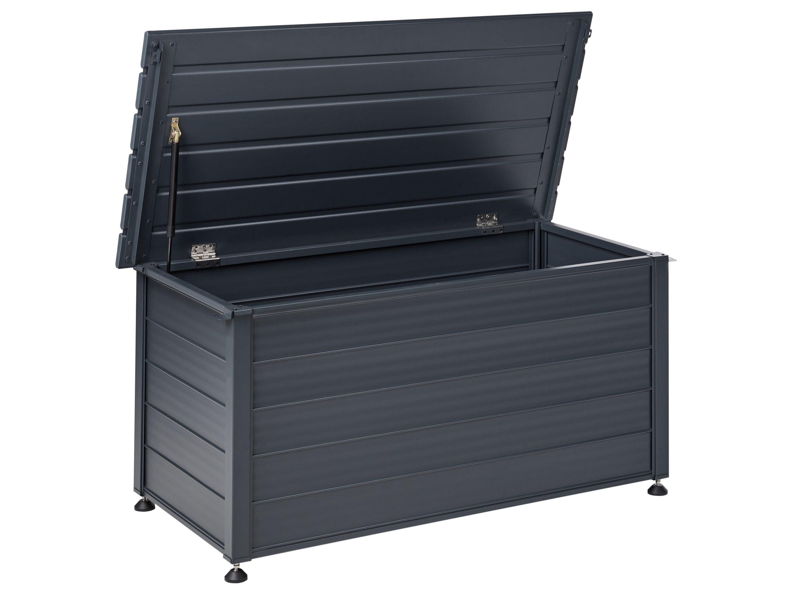 Wetterfeste Alu-Gartenkissenbox mit Gasdruckfeder. Da die Gartentruhe vollständig aus langlebigem Aluminium besteht, ist sie nicht nur für den Aussenbereich perfekt geeignet, sondern auch einfach zu transportieren. Zudem ist die Aufbewahrungsbox mit einem leicht hochklappbaren Deckel versehen, der in einer schönen Holzoptik gehalten ist. Im Inneren der Metalltruhe können Sie Ihre Werkzeuge, Garten-, Sport- oder Campingutensilien über das ganze Jahr vor jeglichen Wettereinflüssen geschützt aufbewahren. Ergänzen Sie die seitlichen Metallbügel mit einem Vorhängeschloss, so können Sie die Truhe für zusätzliche Sicherheit auch abschliessen. Die Höhe der Standfüsse lässt sich regulieren, so kann man die Kissentruhe auch auf unebenen Böden platzieren.