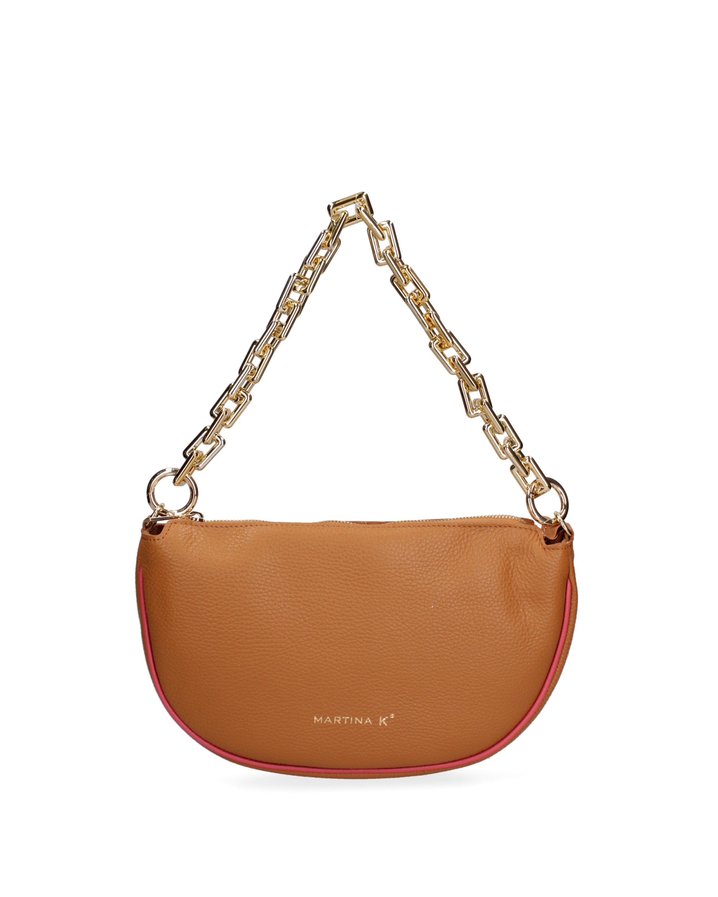 Diese Umhängetasche zeichnet sich durch eine markante Halbmondform aus und bietet ein schickes und kompaktes Accessoire für verschiedene Anlässe. Das Design wird durch einen auffälligen goldfarbenen Kettenriemen ergänzt, der einen Hauch von Eleganz und modernem Flair verleiht. Eine dezente rosa Zierleiste an den Rändern bildet einen verspielten Kontrast zur Hauptfarbe der Tasche.