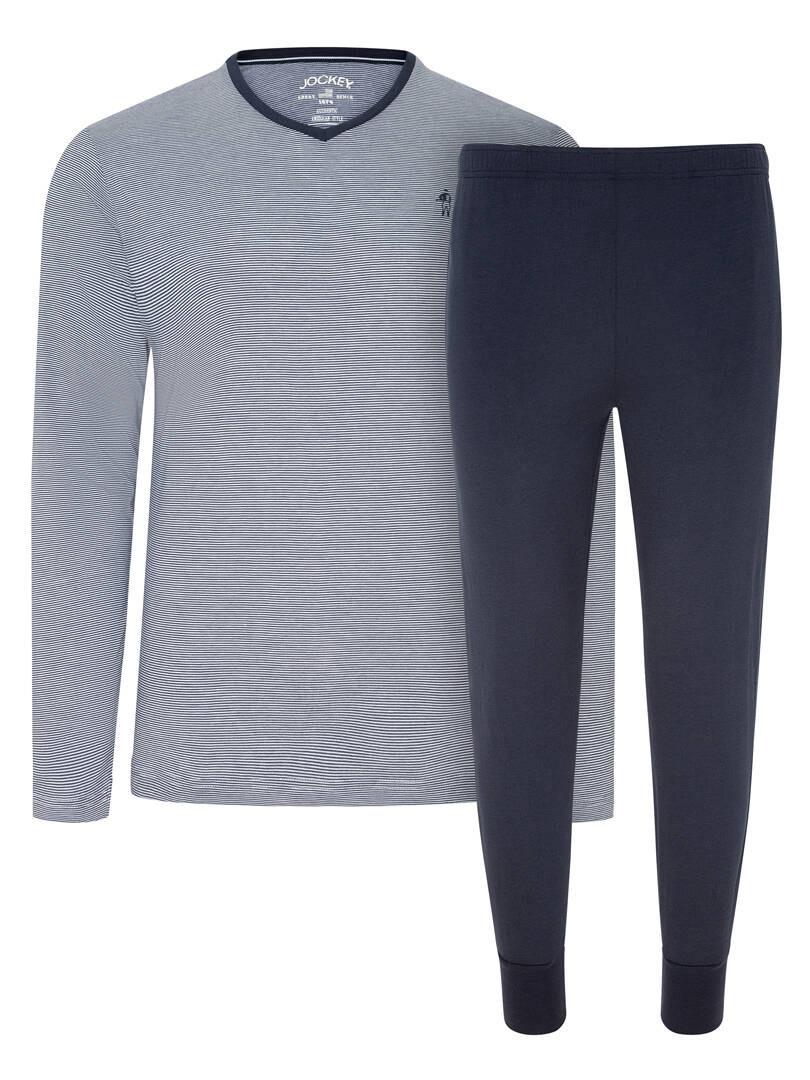 Dieser Pyjama ist für bequemen Schlaf und Entspannung konzipiert und bietet einen stilvollen Look für jede Gelegenheit. Das Set besteht aus einem geringelten V-Neck-Shirt und einer langen Hose im Jogging-Look mit stoffüberzogenem Elastbund und praktischen Seitentaschen.