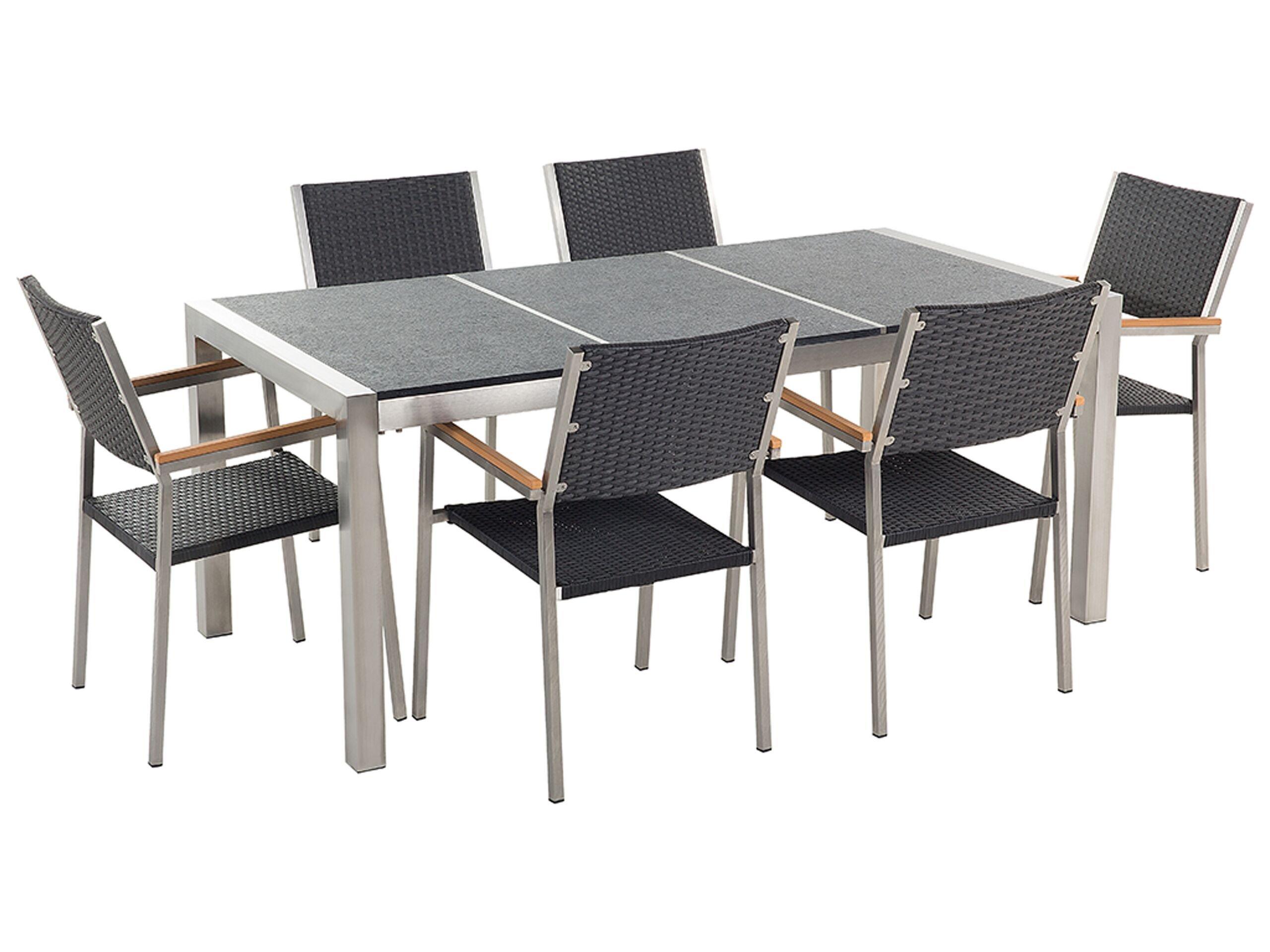 Gartentisch und Stühle in elegantem Design. Das exquisite Tischset aus wertvollem Edelstahl und Naturstein ist ein ganz besonderes Modell in unserer Produktepallette. Die Materialien der Tischplatte bilden ein Zusammenspiel, welches an Robustheit und Eleganz kaum zu übertreffen ist. Der glänzende Rahmen aus gebürstetem Edelstahl ist äusserst stabil und wasserfest. Die schwarze geflammte Steinplatte ist extrem witterungsbeständig und perfekt verarbeitet, so bildet sie eine unverwüstliche Tischoberfläche. Die sechs designer Stühle mit dem standfesten Gestell und erstklassiger Rattansitzfläche in Schwarz harmonieren perfekt mit dem robusten Tisch.