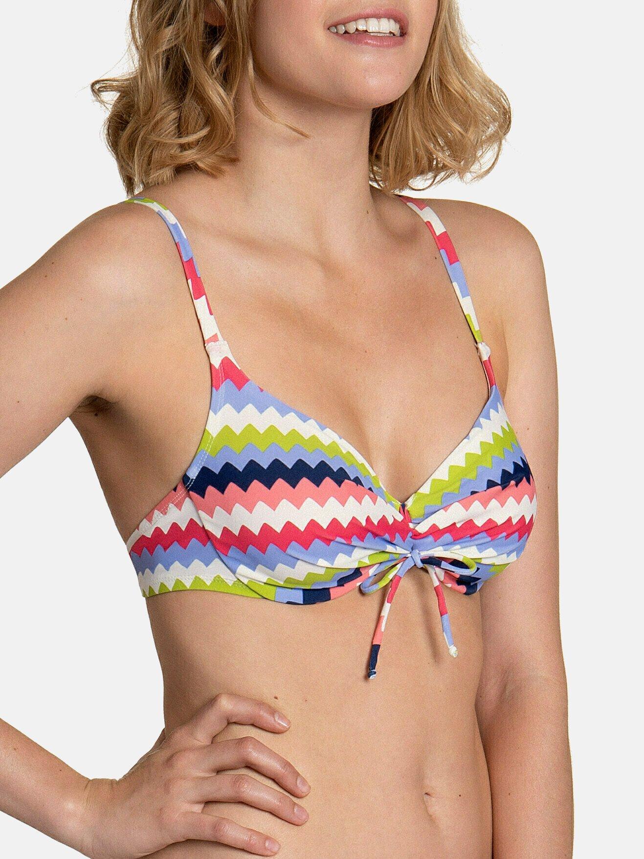 Der Bügel-Bade-BH der Hydra-Kollektion bietet Halt und ist auch für größere Größen geeignet, da das Innenfutter aus Lycra die Brust stützt. Das diagonale Muster auf den armierten Cups betont das Dekolleté. Das verspielte, mehrfarbige Zickzack-Muster ist einfach, leicht zu tragen, farbenfroh und sommerlich frisch. Ein hübsches Band, das durch den Stoff verläuft, erzeugt eine Drapierung der Cups im mittleren Bereich der Vorderseite. Die Träger sind für eine perfekte Passform verstellbar und es verfügt über einen Verschluss im Rücken. Das hochwertige Mikrofasermaterial fühlt sich sehr weich und angenehm auf der Haut an.