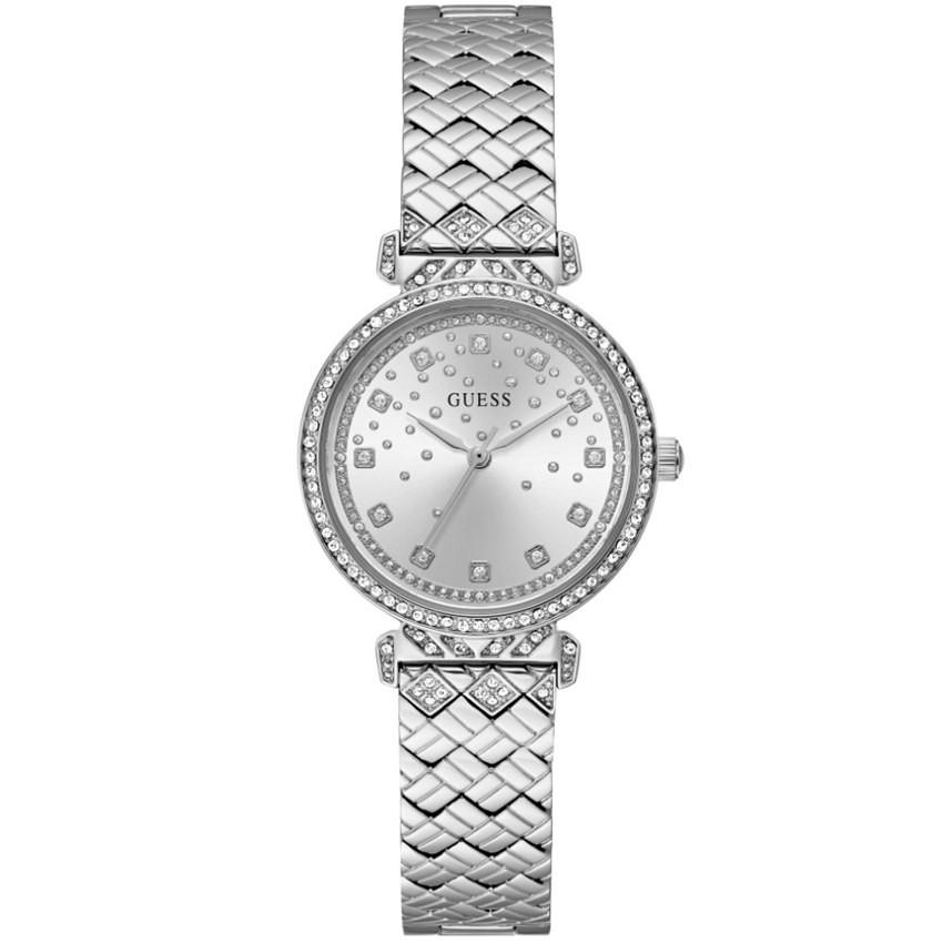 die guess enchantment gw0763l1 ist eine faszinierende damenuhr, die durch ihre eleganz und ihren luxuriösen charme überzeugt. Das gehäuse, gefertigt aus recyceltem stahl, erstrahlt in einer polierten silbertönung und hat einen durchmesser von 32 mm, wodurch es sowohl dezent als auch ausdrucksstark wirkt. Das runde design wird durch eine robuste mineralglaskristalllinse ergänzt, die nicht nur schutz bietet, sondern auch die funkelnden details des silbernen zifferblatts perfekt zur geltung bringt. Das zifferblatt ist mit glitzernden akzenten verziert, die die feminine note dieser uhr unterstreichen. Das armband besteht ebenfalls aus recyceltem stahl und zeigt sich in einer stilvollen silbertönung, die perfekt mit dem gehäuse harmoniert. Mit einer breite von 14 mm und einem praktischen pilotenschnallen-verschluss bietet das armband sowohl komfort als auch sicheren halt. Die hochwertige verarbeitung des gesteppten designs macht das armband zu einem echten hingucker. Für den alltag ist die guess enchantment gw0763l1 bestens geeignet, da sie eine wasserdichtigkeit von 30 metern aufweist. Das bedeutet, dass sie spritzwasser problemlos standhält, obwohl sie primär für elegante anlässe und nicht für den kontakt mit wasser konzipiert ist. Die kombination aus nachhaltigkeit, dank des recycelten materials, und luxuriösem stil macht diese uhr zu einem unverzichtbaren accessoire für jede frau, die auf der suche nach einem umweltbewussten und gleichzeitig glamourösen schmuckstück ist.