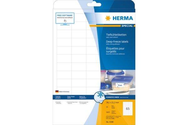 SPECIAL - Etiketten Tiefkühletiketten, auf A4-Blättern, selbstklebend. Ideal für z. B. Tiefkühlverpackungen, Inhalts- und Haltbarkeitshinweise im Gefrierschrank. Sichere Haftung bei tiefen Temperaturen, gute Klebekraft auch im normalen Temperaturbereich. Aufklebetemperatur ab -25 °C, temperaturbeständig bis -60 °C. Umweltfreundlich: hochwertiges, chlorfrei gebleichtes Spezialpapier, PEFC-zertifiziert, lösemittelfreier Haftkleber. Sehr gute Druckergebnisse auf allen Laser- und Inkjetdruckern, Kopierern, Farblaserdruckern und Farbkopierern. Kostenlose Softwarelösungen: www.herma.de/software.