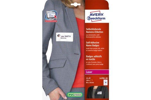 Die selbstklebenden, ablösbaren Namens-Etiketten L4785-20 für Laser-Drucker von AVERY ZWECKFORM im Format 80 x 50 mm erleichtern Ihnen die Organisation von Veranstaltungen, Seminaren und Konferenzen (200 weisse Textil-Etiketten pro Packung). Sie sind die perfekte Alternative zu Plastikschildern mit Nadel oder Clip. Die Namensschilder aus Acetatseide haften zuverlässig auf Kleidung und Textilien und lassen sich rückstandsfrei wieder ablösen. Die Rückseiten-Stanzung der Namensschilder erlaubt das einfache Heraustrennen der Namens-Etiketten samt Trägerfolie für eine spätere Verwendung. Die Textil-Etiketten sind nicht geeignet für Leder, Seide, Samt und andere empfindliche Textilien. Die Namens-Etiketten bieten einen garantiert staufreien Druckerdurchlauf auf allen gängigen Laser-Druckern. Gestalten und bedrucken Sie Ihre Namensschilder schnell und einfach - mit den kostenlosen Avery Zweckform Etiketten-Vorlagen klimaneutrale Unternehmen Avery Zweckform verwendet schon seit 2014 ausschliesslich Ökostrom/-gas. Forschung, Entwicklung, Produktion, Logistik und Verwaltung am Firmenstandort in Oberlaindern/Bayern garantieren höchste Qualitätsstandards, hohe Umweltvorgaben und kurze Lieferwege. Die Etiketten aus PVC-freier Acetatseide werden klimaneutral hergestellt, die Emissionen des Materials werden kompensiert. Made in Germany.