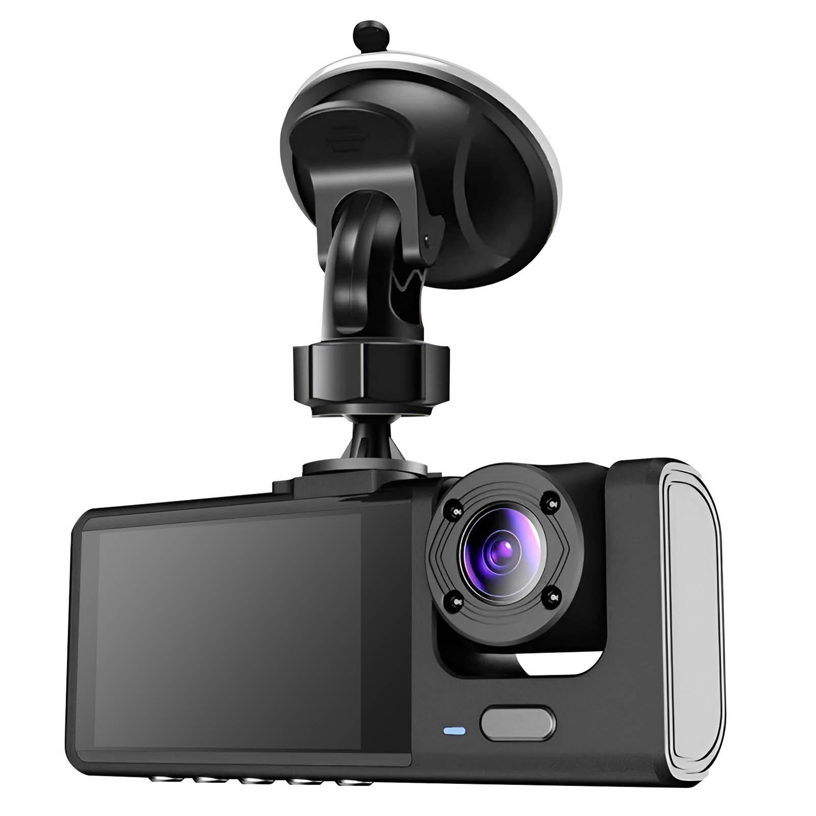Dashcam Auto Windschutzscheibe mit Saugnapf. HD-Kamera: Vorderseite 170°, Rückseite 110°, Innenseite 110°. 2'' LCD-Bildschirm. G-Sensor. Erkennung von Bewegungen. Eingebautes Mikrofon. USB 2.0 und AV-Ausgang. Kontrolltasten.