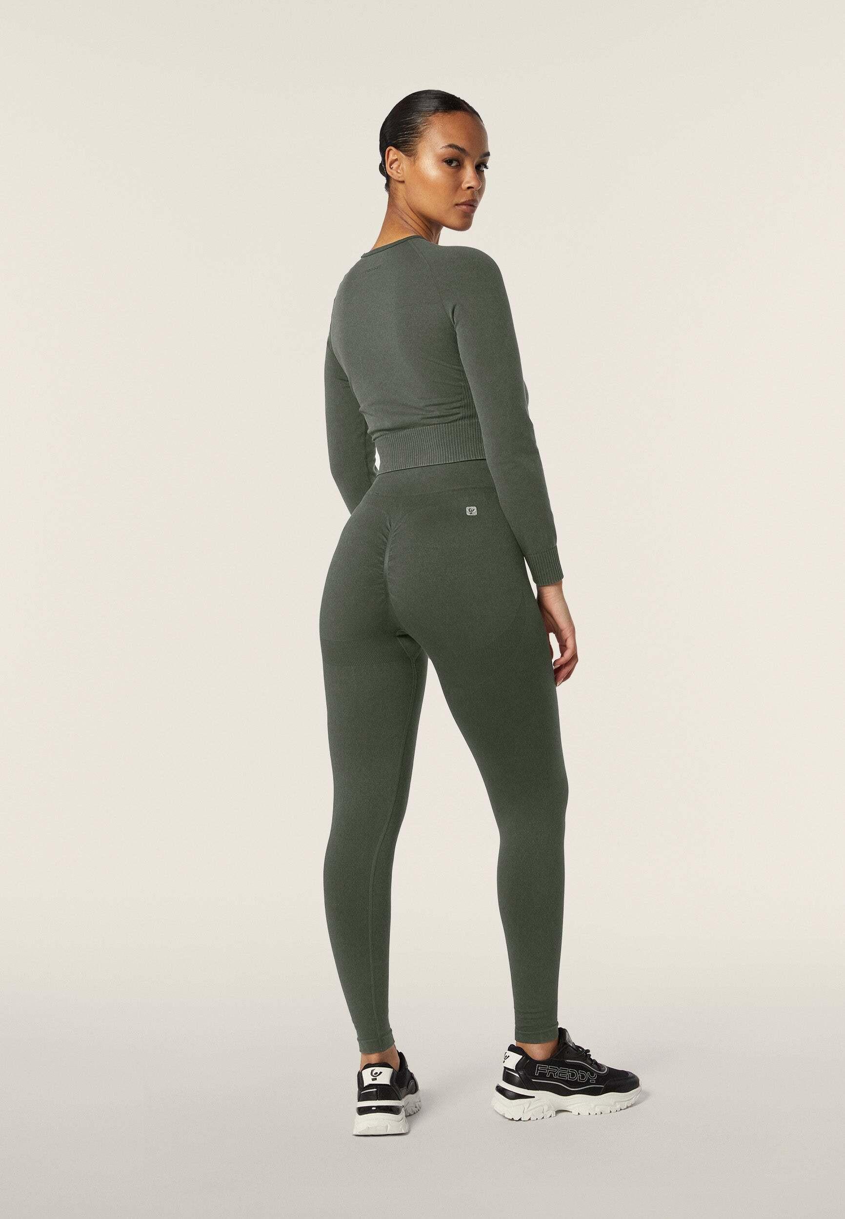 Mit diesem Outfit aus Cropped-Jersey und 7/8-Leggings mit hohem Taillenbund kannst du deinen Look im Fitnessstudio aufpeppen. Es wurde für maximalen Halt und Komfort mit minimalen Nähten entwickelt und besteht aus Stretch-Polyamid, einem Stoff, der zu 60 % aus recycelten Materialien besteht. Die Ice-Wash-Färbung verleiht ihm ein unverwechselbares, kerniges Aussehen. Das Shirt ist an der Taille kurz, hat lange Ãrmel und ist an den Seiten und unten gerippt, damit es besser sitzt, wenn du dich bewegst. Die Leggings haben einen hohen Taillenbund und sind an den Hüften hinten gerippt, um deine Kurven zu betonen und natürlich zu unterstützen.