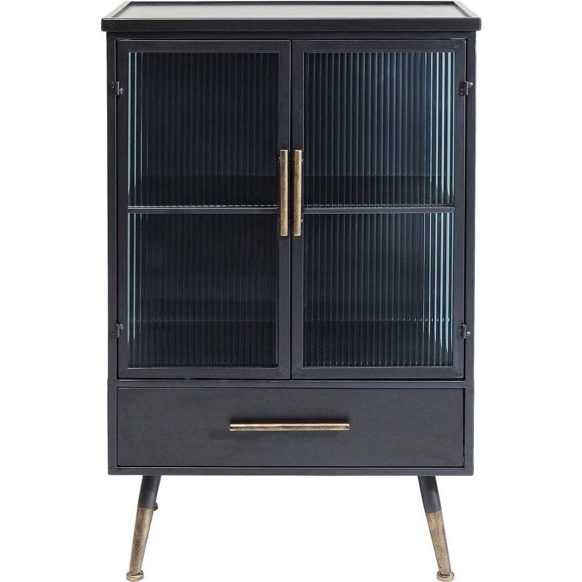 Beschichteter Stahl und Glas das sind die Zutaten, die den lässigen Look dieses Vitrinenschranks im Kleinformat prägen. Während die Konstruktion des Highboards aus Stahl ist, sind Fronten und Seiten aus gerilltem Glas das sorgt für eine gewisse Leichtigkeit und Eleganz. Typisch für die Serie La Gomera, zu der verschiedene Schränkchen und Kommoden gehören, sind neben dem Material-Mix Stahl/Glas die klare Linienführung und die leicht ausgestellten Füsse.Praktische und schicke Kommoden-Vitrine in Schwarz im lässigen Understatement-Look für Küche, Bad, Arbeits- oder WohnzimmerSchmückendes Detail: die messingfarbenen Griffe und Füsse, die dem Industrie-Design eine edle Note verleihenEin kleines Stauraum-Wunder mit einer Schublade und zwei Ablageflächen hinter den halbtransparenten GlastürenPerfekt für Wohnküchen oder auch fürs Bad. Einfach zu kombinieren, ohne seinen Charakter zu verleugnenLässt sich hervorragend mit den anderen Modellen aus dieser Möbel-Serie kombinierenProduktinformation Korpus: Stahl pulverbeschichtet (Seitenteile gerahmt und Rückwand), Abdeckplatte: mitteldichte Faserplatte lackiert, Glas Sicherheitsglas ESG klar (Wellenschliff), Seitenteile: Glas Sicherheitsglas ESG klar (Wellenschliff), Fuss/Füsse: Stahl pulverbeschichtet, Fachboden: Stahl pulverbeschichtet, Schublade: mitteldichte Faserplatte lackiert, Tanne Massivholz lackiert Schubladenfront, Griffe: Stahl pulverbeschichtet, Tür: Stahl pulverbeschichtet gerahmt, Glas Sicherheitsglas ESG klar (Wellenschliff), Fachboden: fest montiert, 15 kg max. Belastbarkeit (Abdeckplatte), 10 kg max. Belastbarkeit (Fachboden/Schublade), zerlegt, 1 Fachboden (festmontiert) Innenmass Schublade BHT 57 x 28 x 11