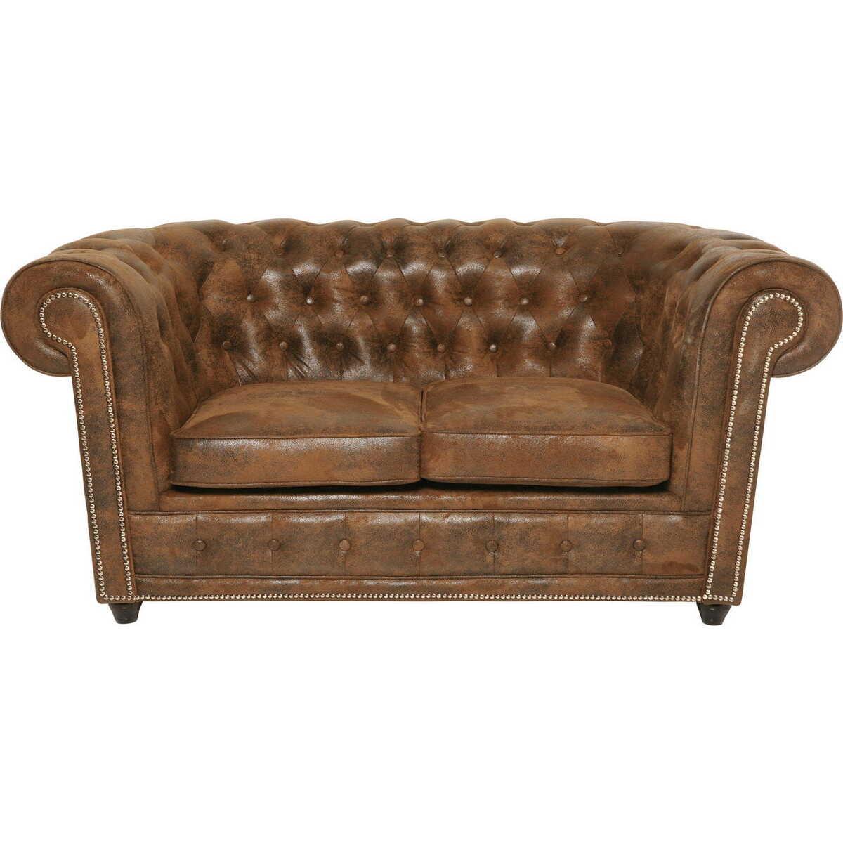 Hat Geschichte und ist trotzdem modern: das Chesterfield-Sofa. Erfunden haben es die Engländer und lange stand es als Symbol für ein gediegenes Polstermöbel im Stile englischer Salons. Heute finden Sessel und Couches im Chesterfield-Stil ihren Platz in Raumkonzepten im Industrie- und Loftstil. Zu modernen Möbeln sind sie ein gekonnter Stilbruch. Sein zeitloses Design, das sich leicht kombinieren lässt, macht das Chesterfield zur idealen Einrichtungslösung für jeden Wohnbereich.Hochwertiges Zweisitzer-Sofa in Braun im klassischen Chesterfield Stil mit Nieten-DetailsPflegeleichter Bezug aus Kunstfaser in aufwändiger Vintage-LederoptikDunkle, traditionell gedrechseltes Füsse aus MassivholzFallen lassen und liegen blieben: Extrabequem mit umlaufender Arm- und Rückenlehne und gemütlicher, knopfgehefteter PolsterungFallen lassen und liegen blieben: Extrabequem mit umlaufender Arm- und Rückenlehne und gemütlicher, knopfgehefteter PolsterungProduktinformation Korpus: Kiefer Furnierschichtholz naturbelassen, Polsterung: 100 % Polyurethan, Bezug: 100 % Polyester-Mikrofaser, Polsterung: Elastische Gurtaufhängung, 50 cm Sitzhöhe, Polsterung Sitzfläche: 30 kg/m_ Schaum, Polsterung Rücken: 28 kg/m_ Schaum, Polsterung Armlehne: 25 kg/m_ Schaum, teilzerlegt