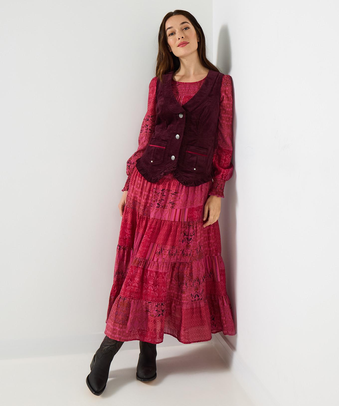 Diese Cordweste bietet eine feminine Interpretation eines klassischen Designs und ist ein unverzichtbares Stück für einen ausdrucksstarken Look. Sie verfügt über ein stilvolles Design mit Rüschen und praktischen Taschen, was sie zu einer vielseitigen Ergänzung für jede Garderobe macht. Die Weste ist so konzipiert, dass sie eine bequeme, taillierte Silhouette und einen Hauch von Eleganz bietet.