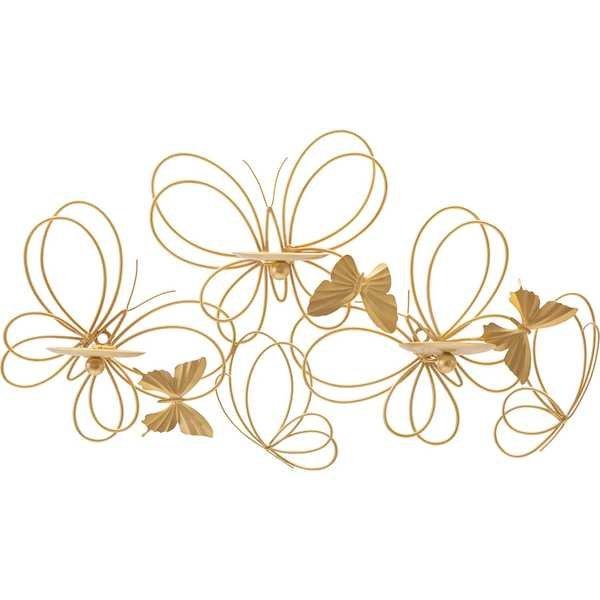Wandkerzenhalter aus goldfarbenem Metall mit Linien und Verzierungen, die eine Reihe von fliegenden Schmetterlingen darstellen. Kann 3 Kerzen aufnehmen.