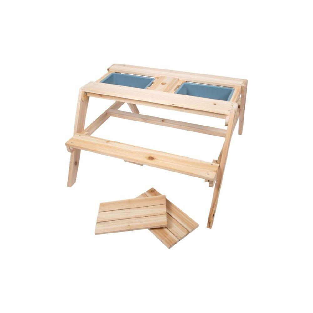 Spielen und Matschen für kleine Entdecker. Dieser Picknicktisch aus wetterbeständigem Vollholz bietet eine kreative Spielmöglichkeit im Freien. Mit zwei herausnehmbaren Kunststoffschüsseln für Sand oder Wasser und klappbaren Sitzbänken kann das Möbelstück vielseitig genutzt werden. Ein integriertes Loch ermöglicht die Verwendung eines Sonnenschirms, und die herausnehmbaren Platten verwandeln den Tisch schnell in einen Matschtisch.