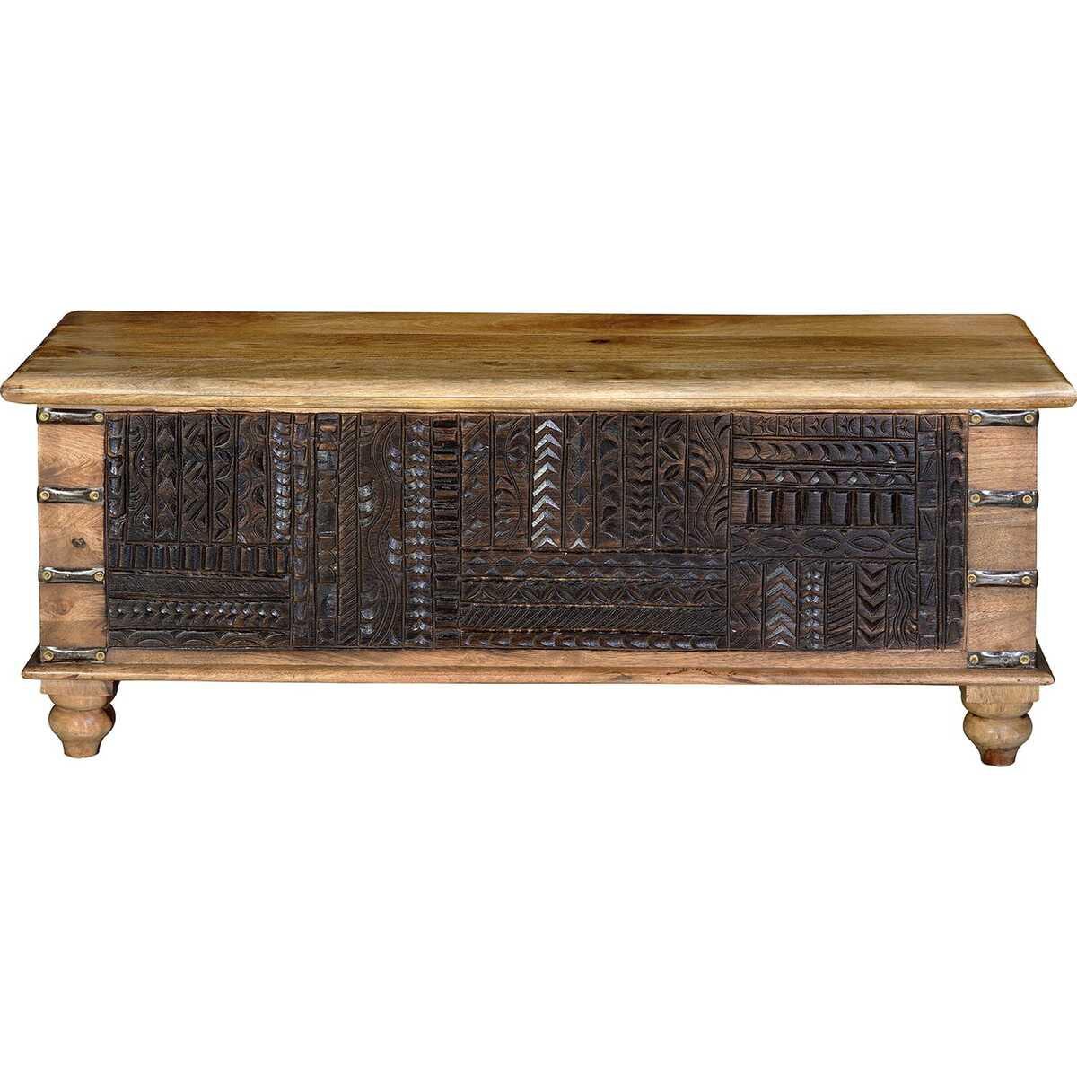 Truhe aus Mangoholz mit handgeschnitzter Front und grossem Fassungsvermögen.