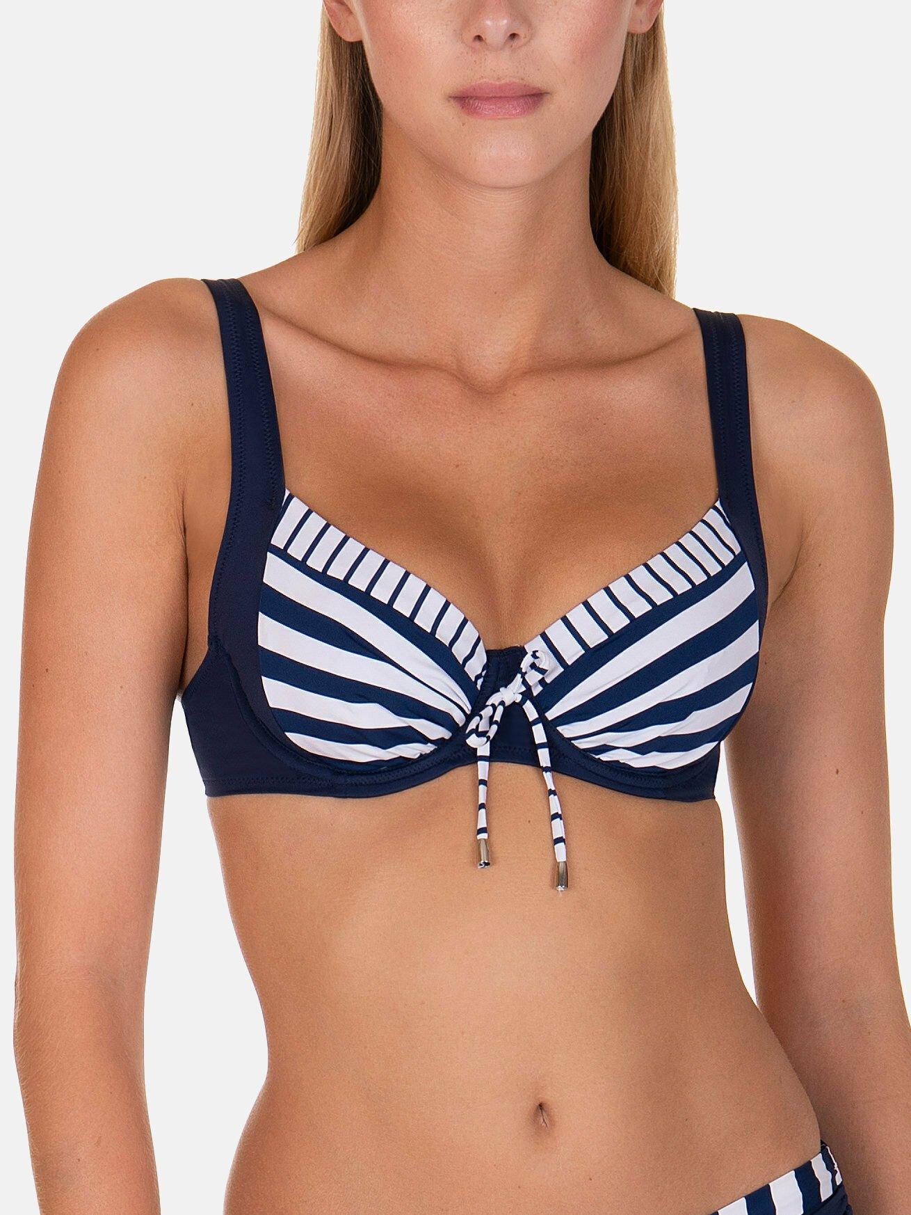 Dieses Bügel-Bikini-Oberteil aus der Havana Kollektion bietet sowohl Halt als auch Stil. Der bewährte, funktionelle Bügel-Bade-BH verfügt über breite Träger, die auch bei großen Cups optimalen Halt bieten. Das einfarbige Material an den Trägern und um die Brust herum verkleinert optisch deren Größe. Die Cups sind mit verschlungenen Streifen in verschiedenen Größen bedruckt, die in unterschiedlichen Richtungen angeordnet sind. Der Stoff ist sehr angenehm zu tragen, und kleine Bänder zum Binden zwischen den Cups setzen ein charmantes Detail.