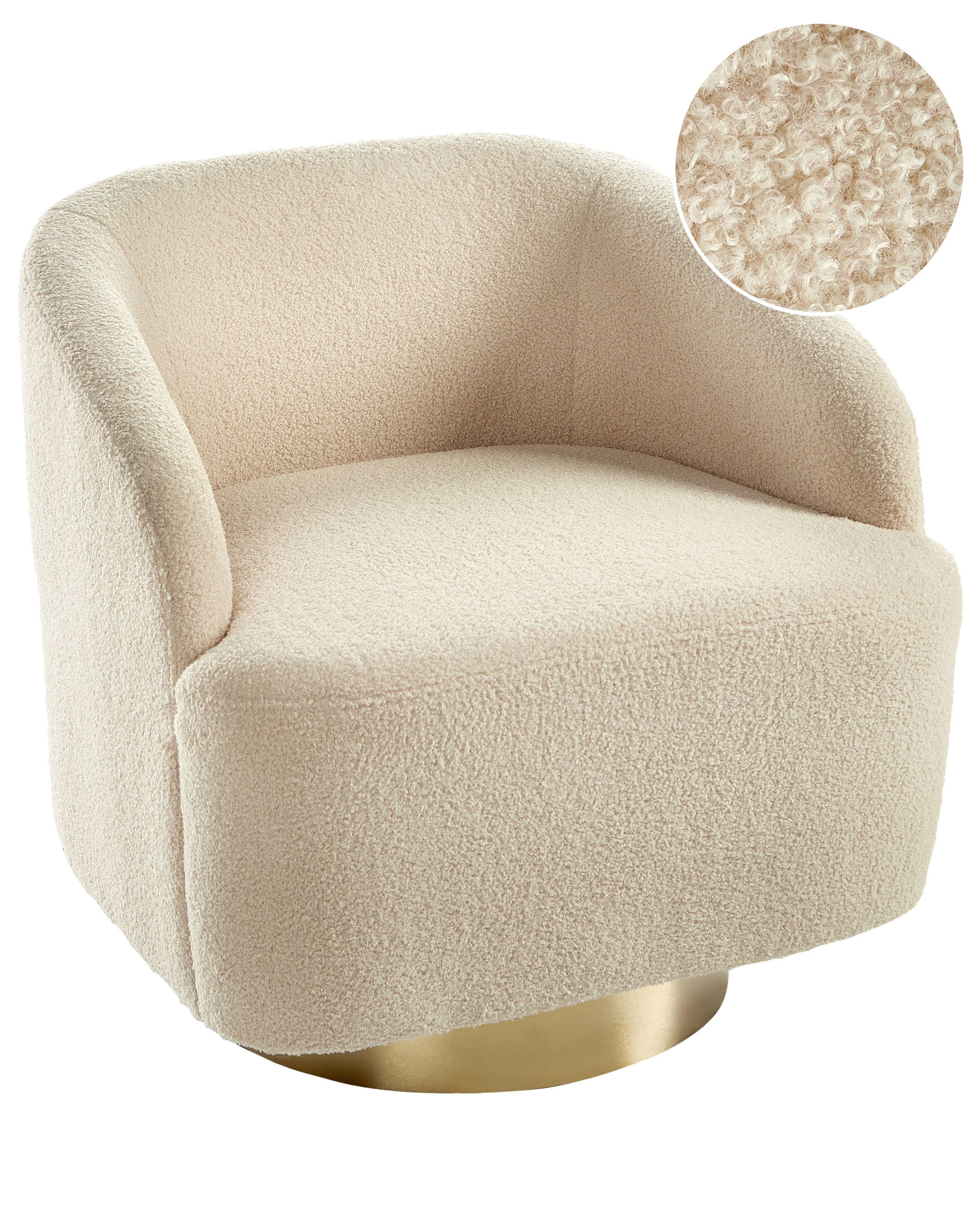 Stilvoller Drehsessel. Dieser stilvolle Retro-Sessel ist ein echter Hingucker in jedem Wohnzimmer und wird schnell zu einem Lieblingsplatz zum Entspannen. Er ist mit hochwertigem, beige Bouclé gepolstert, der sehr weich ist und eine einzigartige, angenehme Textur bietet. Das Möbelstück verfügt außerdem über einen goldenen Sockel, der als Drehpunkt dient und somit das Umstellen des Sessels erspart, wenn man seine Sitzposition ändern möchte.
