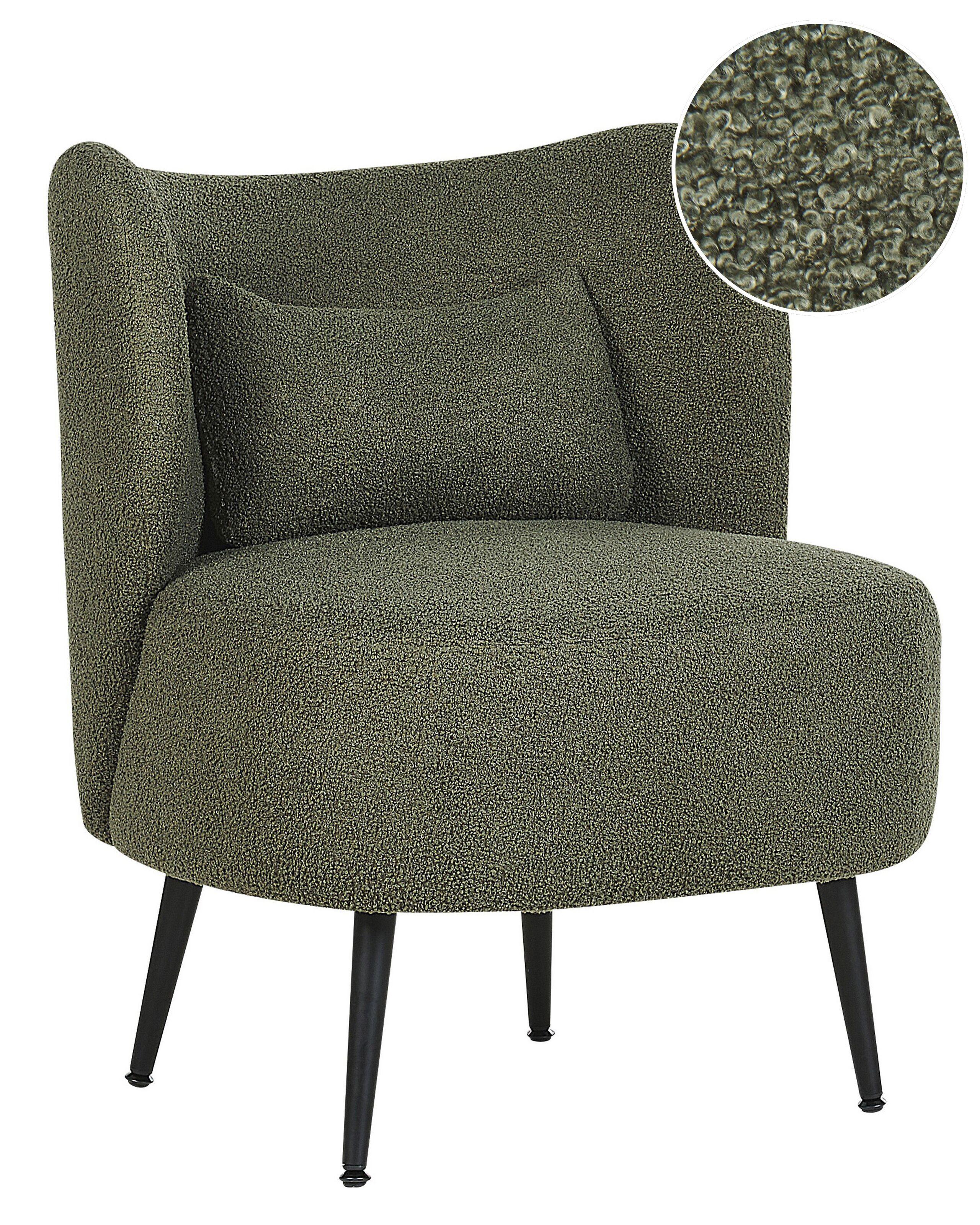 Stilvoller Stuhl mit geschwungener Rückenlehne. Verwandeln Sie Ihr Wohnzimmer mit diesem Polsterstuhl in einen stilvollen Entspannungs- oder Konferenzraum. Er ist aus strapazierfähigem Bouclé-Stoff gefertigt, hat ein glamouröses Retro-Design und passt mit seiner dunkelgrüne Farbe zu vielen Einrichtungsstilen. Es benötigt keine tägliche Pflege und hält viele Jahre, was es zu einer guten Wahl für sehr beanspruchte Haushalte macht. Die geschwungene Rückenlehne und das mitgelieferte Kissen sorgen für stundenlangen Sitzkomfort.