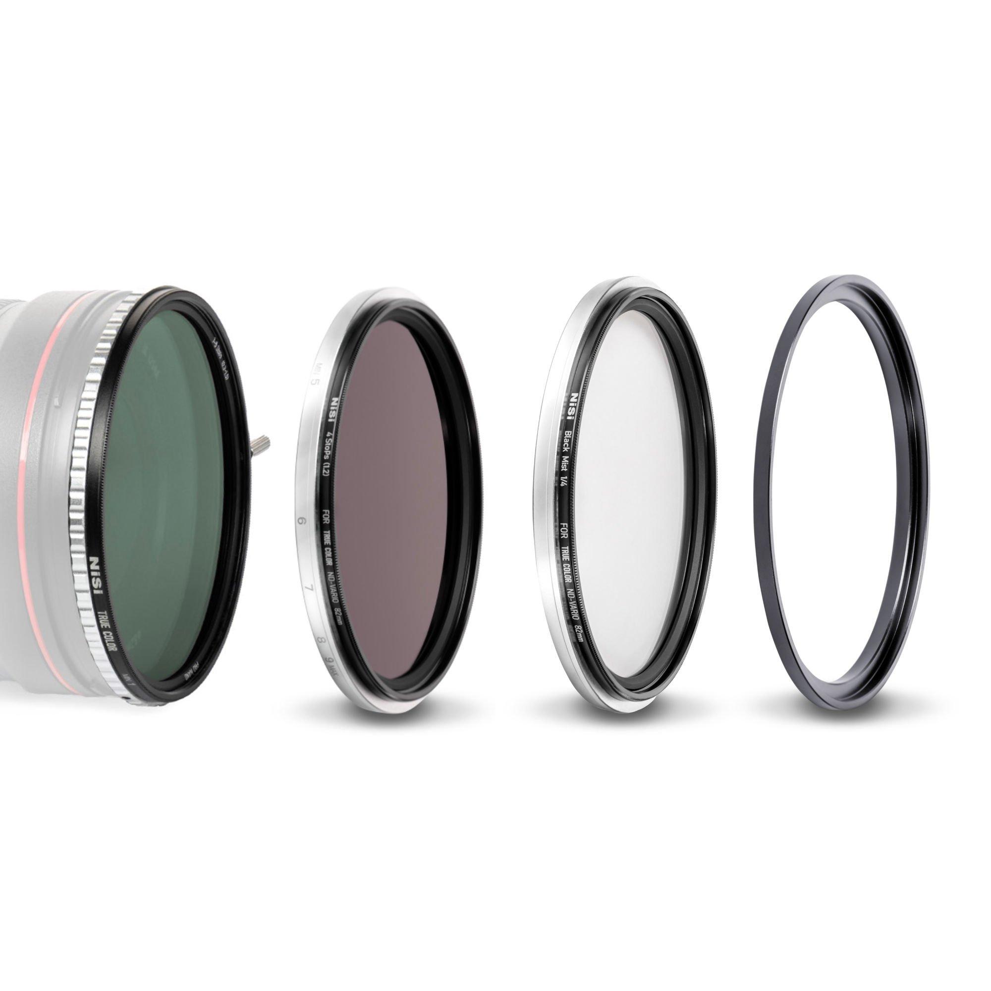 Objektivfilter Anwendung: Filter-Kit, Filterdurchmesser: 82 mmBlack Mist 1/4Filter-Kit mit einem Durchmesser von 82 mmND-VARIO 1-5 StopsND 4 StopsAdapter RingObjektivdeckelLieferumfang:ND-VARIO 1-5 StopsND 4 StopsBlack Mist 1/4Adapter RingObjektivdeckelTasche