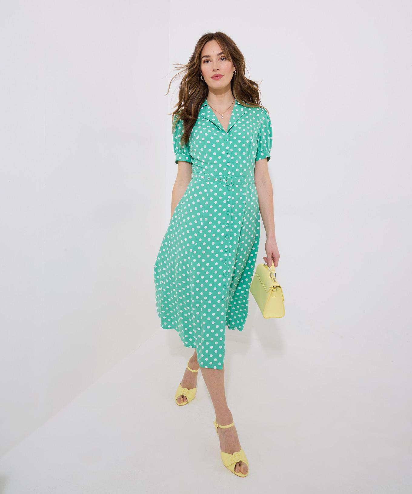 Dieses gepunktete Midikleid verfügt über einen klassischen Kragen und eine durchgehende Knopfleiste, die einen zeitlosen und eleganten Look verleihen. Das Kleid ist mit kurzen Puffärmeln und einem passenden Gürtel zur Taillierung versehen, um eine schmeichelhafte Silhouette zu schaffen.