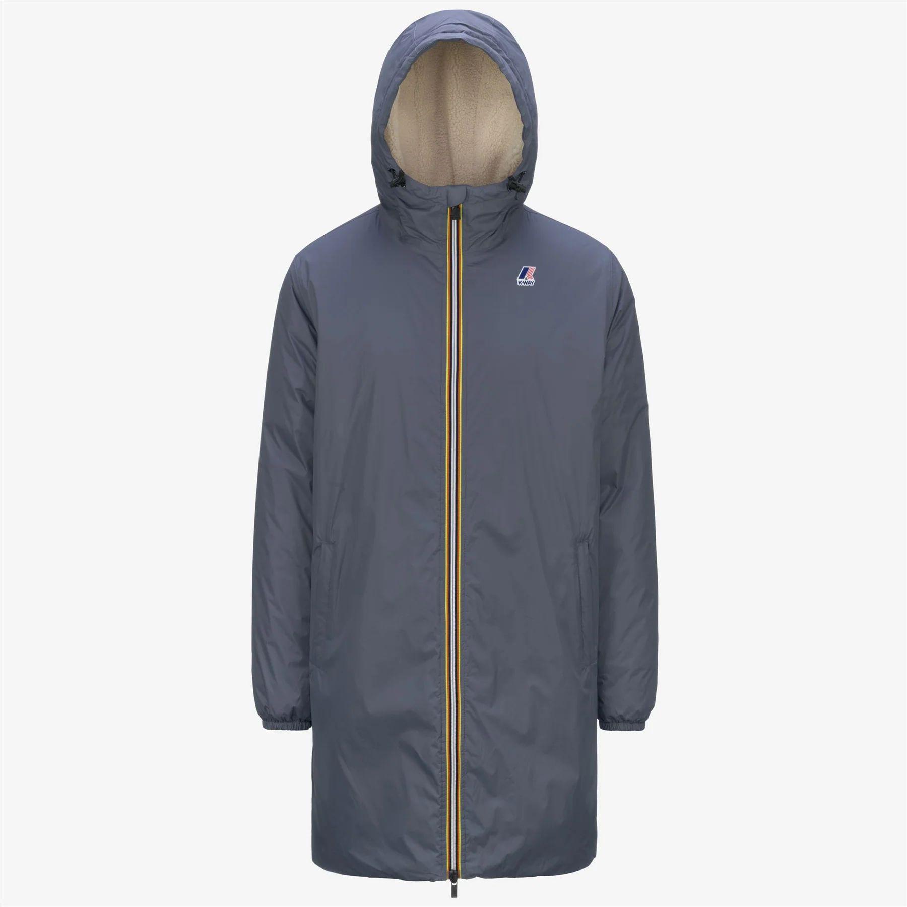 Die Jacke verfügt über einen vorderen Reissverschluss mit gelben und weissen Streifen sowie Ärmel mit elastischen Bündchen für eine präzise Passform. Das Innenfutter der Kapuze ist beige, während die K-Way-Logo-Aufschrift auf der linken Seite des Oberkörpers rot, schwarz und lila ist.