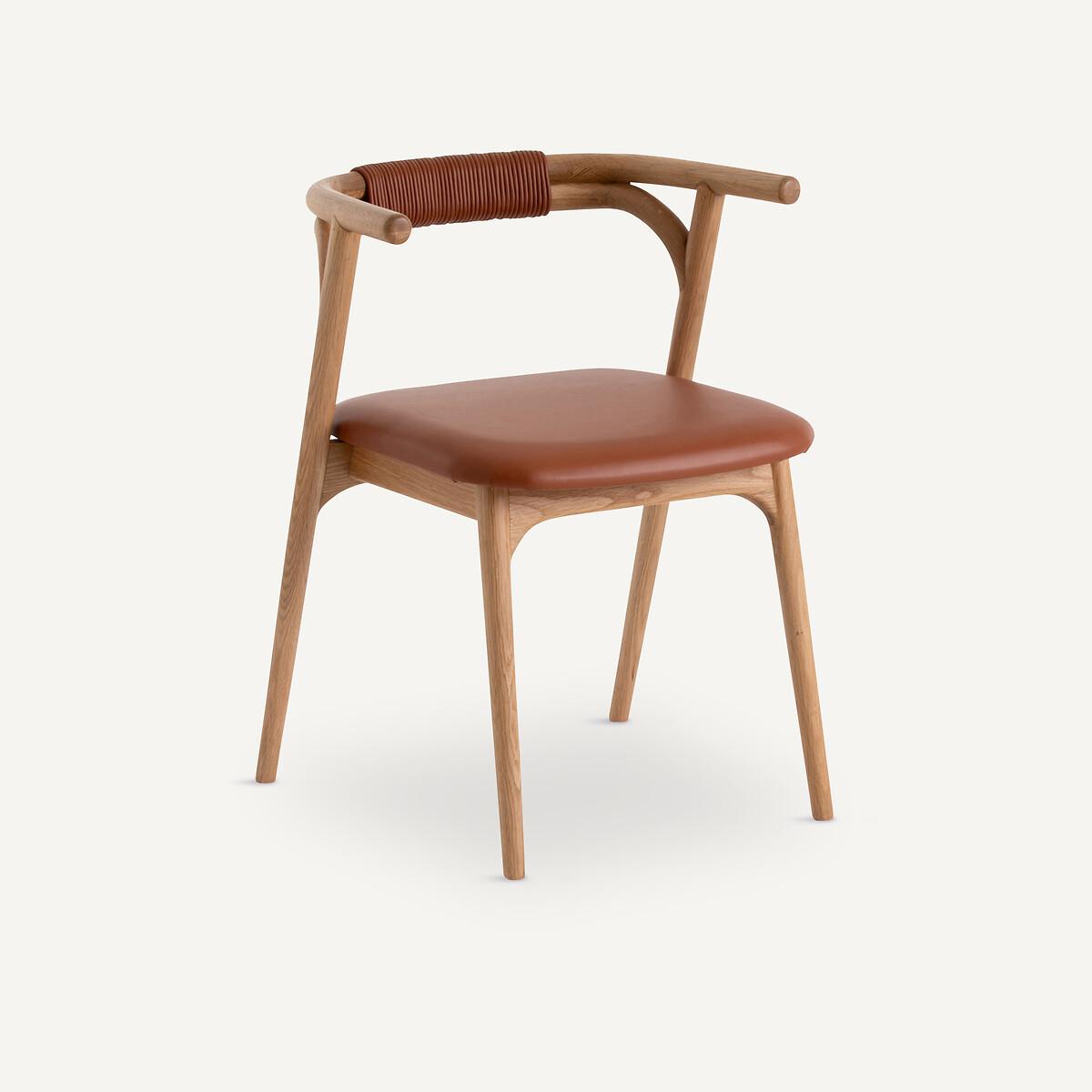 Der Esszimmerstuhl Fermyo kombiniert eine gebogene Rückenlehne aus massivem Eichenholz und eine elegante, mit italienischem Leder bezogene Sitzfläche.