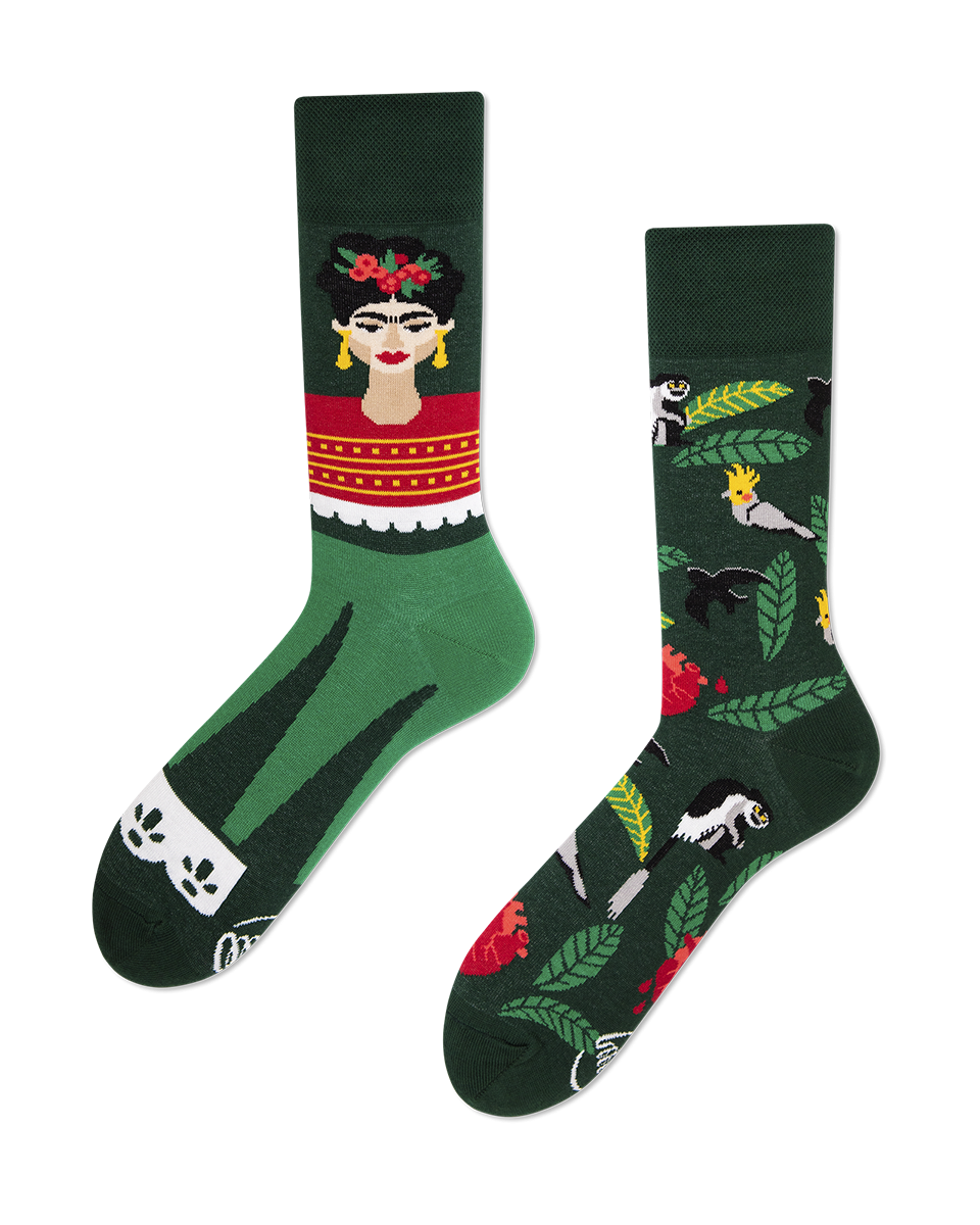 - Eine Socke zeigt ein von Frida Kahlo inspiriertes Porträt