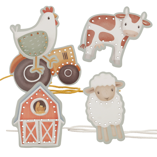 Set mit 5 Little Dutch Fädelkarten aus der Little Farm-Serie mit Bildern einer Kuh, eines Schafs, eines Traktors und mehr. inkl. Faden in verschiedenen Farben.