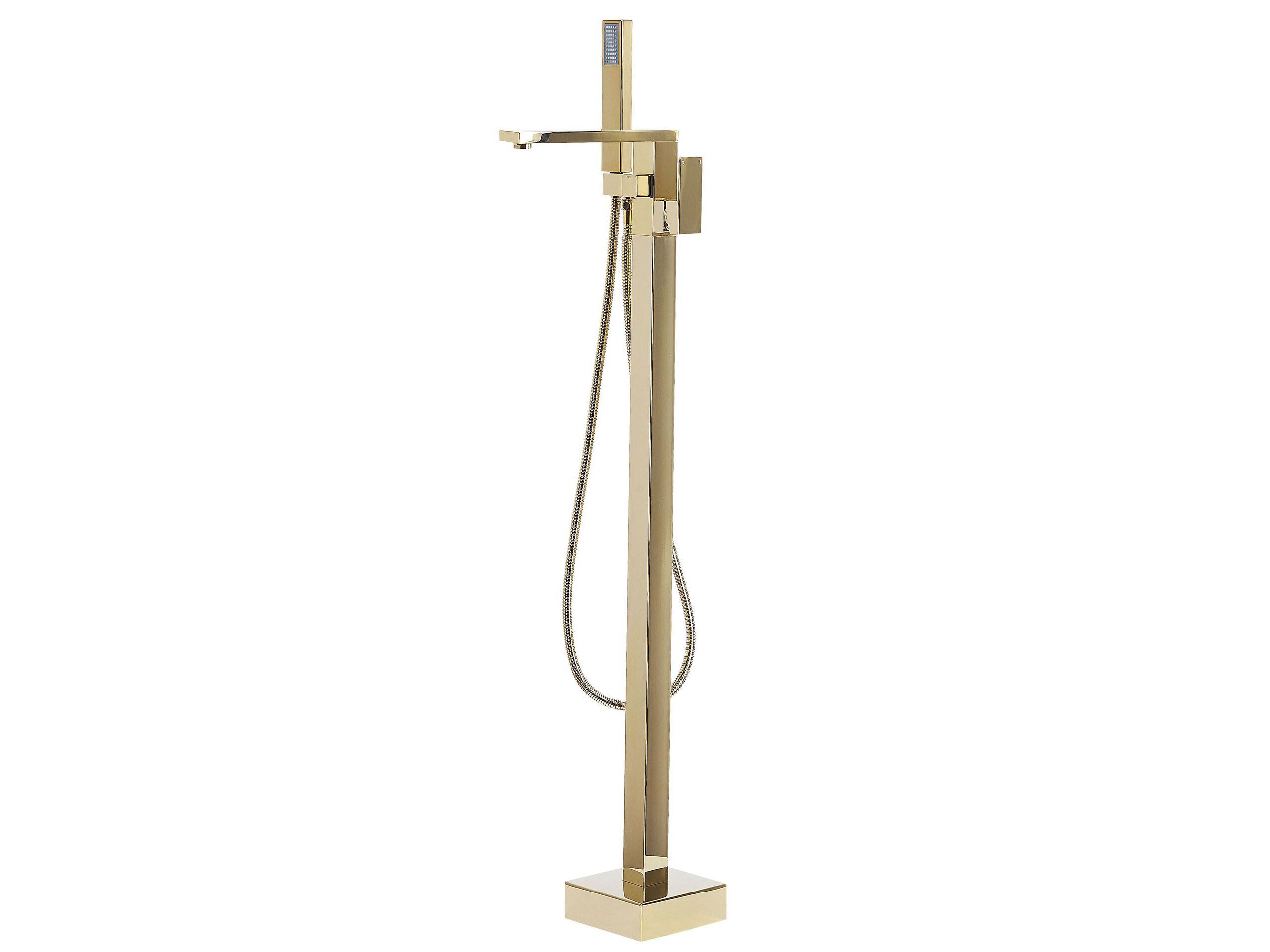 Freistehende Badewannenarmatur im eleganten Gold. Dank der geradlinigen und äusserst modernen Formgebung, sowie der dekorativen Optik im glänzenden Gold ist diese Armatur ein Must-have für alle, die es futuristisch und minimalistisch mögen. Die bodenstehende Wannenbatterie ist mit einem Einhebelhandmischer und einer Standhandbrause ausgestattet und garantiert der Edelstahlarmatur eine präzise und kinderleichte Regelung der Auslaufmenge und Wassertemperatur.
