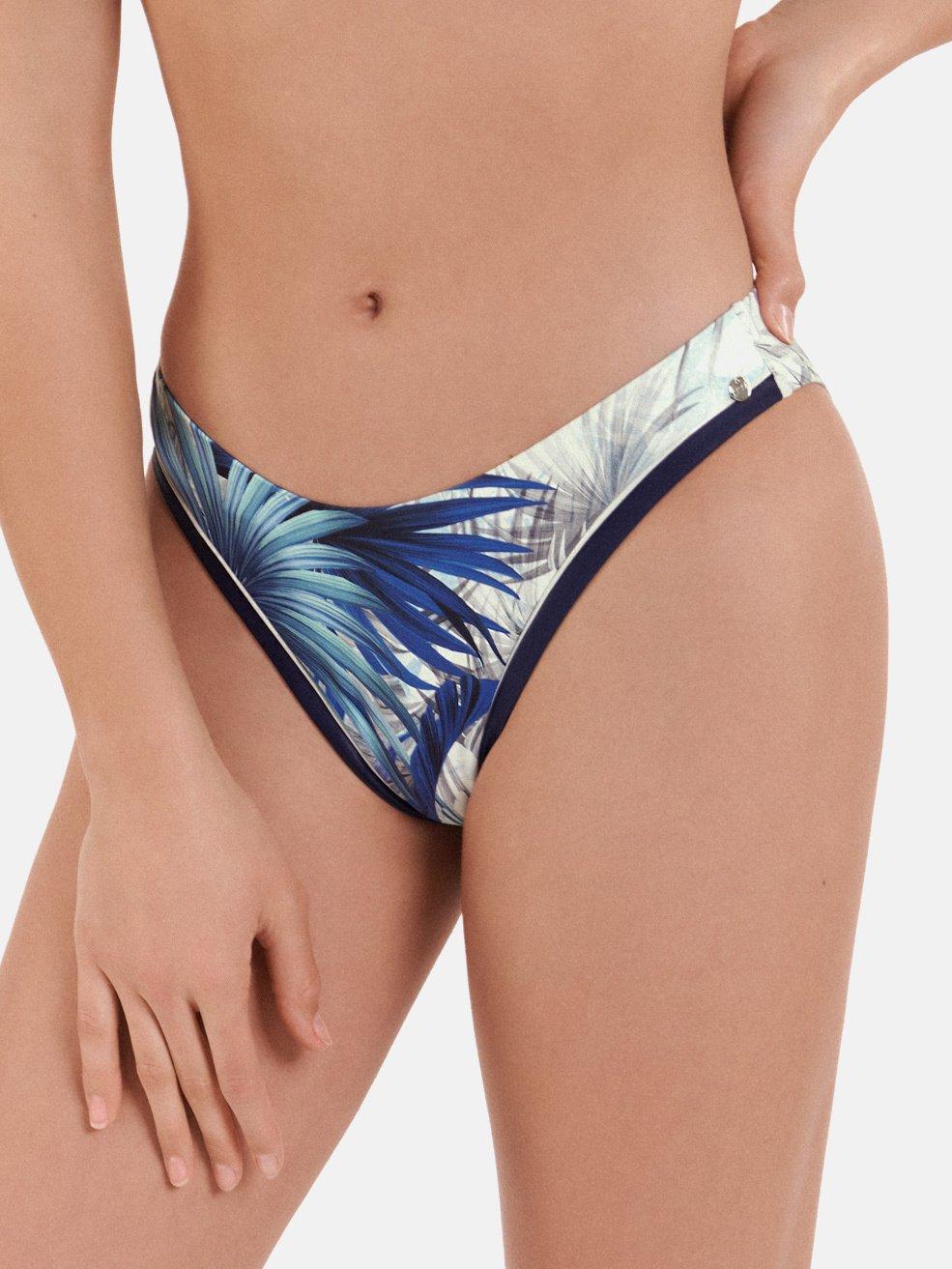 Die Ensenada Bikini-Hose von Lisca präsentiert sich mit einem tief ausgeschnittenen Design, das eine moderne und schmeichelhafte Silhouette bietet. Die nahtlose Konstruktion an Taille und Beinöffnungen sorgt für einen glatten Sitz. Eine monochrome Einfassung entlang der Taille und dekorative Borten sowie subtile Glitzerstreifen veredeln das Design. Der tropische Blätter- und Blumendruck verleiht einen lebendigen und raffinierten Touch, wobei die Farbintensität vorne satter und hinten etwas heller ist. Eine kleine dekorative Plakette in Gold oder Silber rundet den Look ab.