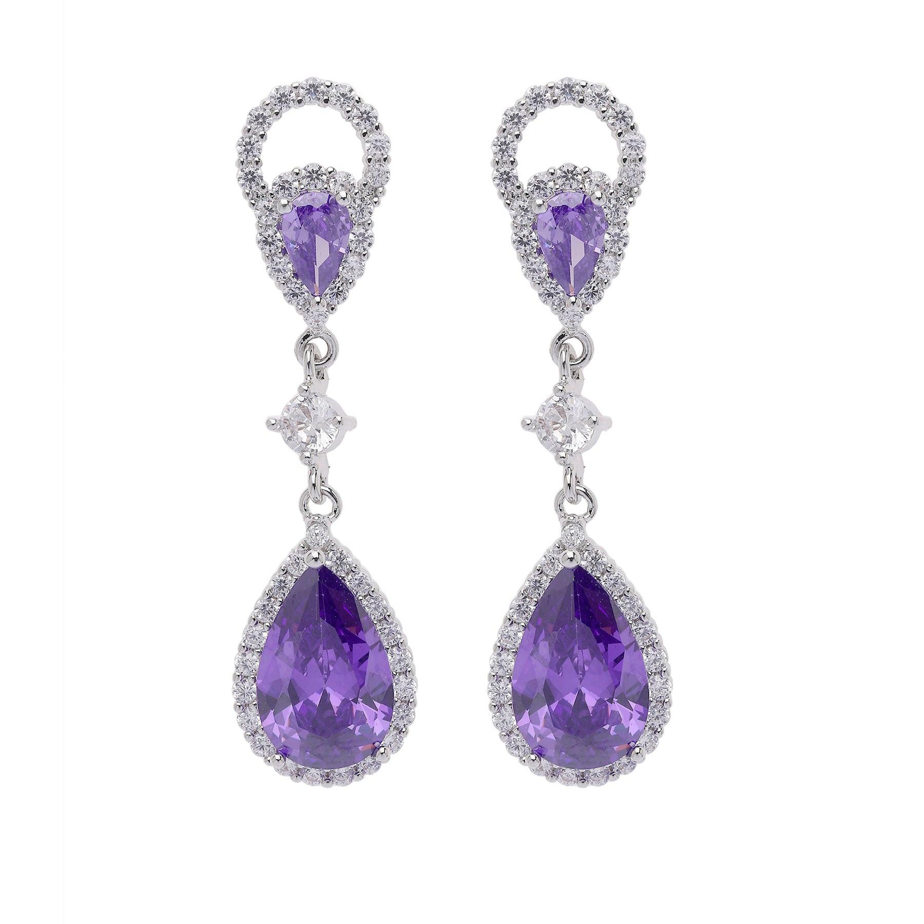 Diese eleganten Ohrhänger bestechen durch ihr funkelndes, mehrstufiges Design. Ein kreisförmiger Kristallkranz umgibt einen tiefvioletten Stein und führt zu einer zarten Kette mit einem zentralen Kristallakzent. Im Mittelpunkt steht ein großer, tropfenförmiger violetter Stein, eingefasst von einem Rand aus schimmernden Kristallen, der einen raffinierten und glamourösen Look erzeugt. Größe: 1,0 cm x 4,0 cm | Beschichtung: Rhodiumplattiert | Verschluss: Stecker und Rückseite