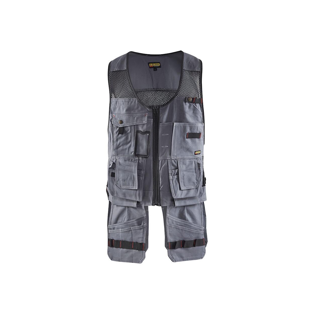 Verteilen Sie das Gewicht mithilfe einer strapazierfähigen Weste auf den Oberkörper. Die Weste hat zwei Brusttaschen, eine mit Patte und einer Handytasche und eine mit einer Stifttasche. Zwei verstärkte Nageltaschen und zwei Scherentaschen mit Patte.