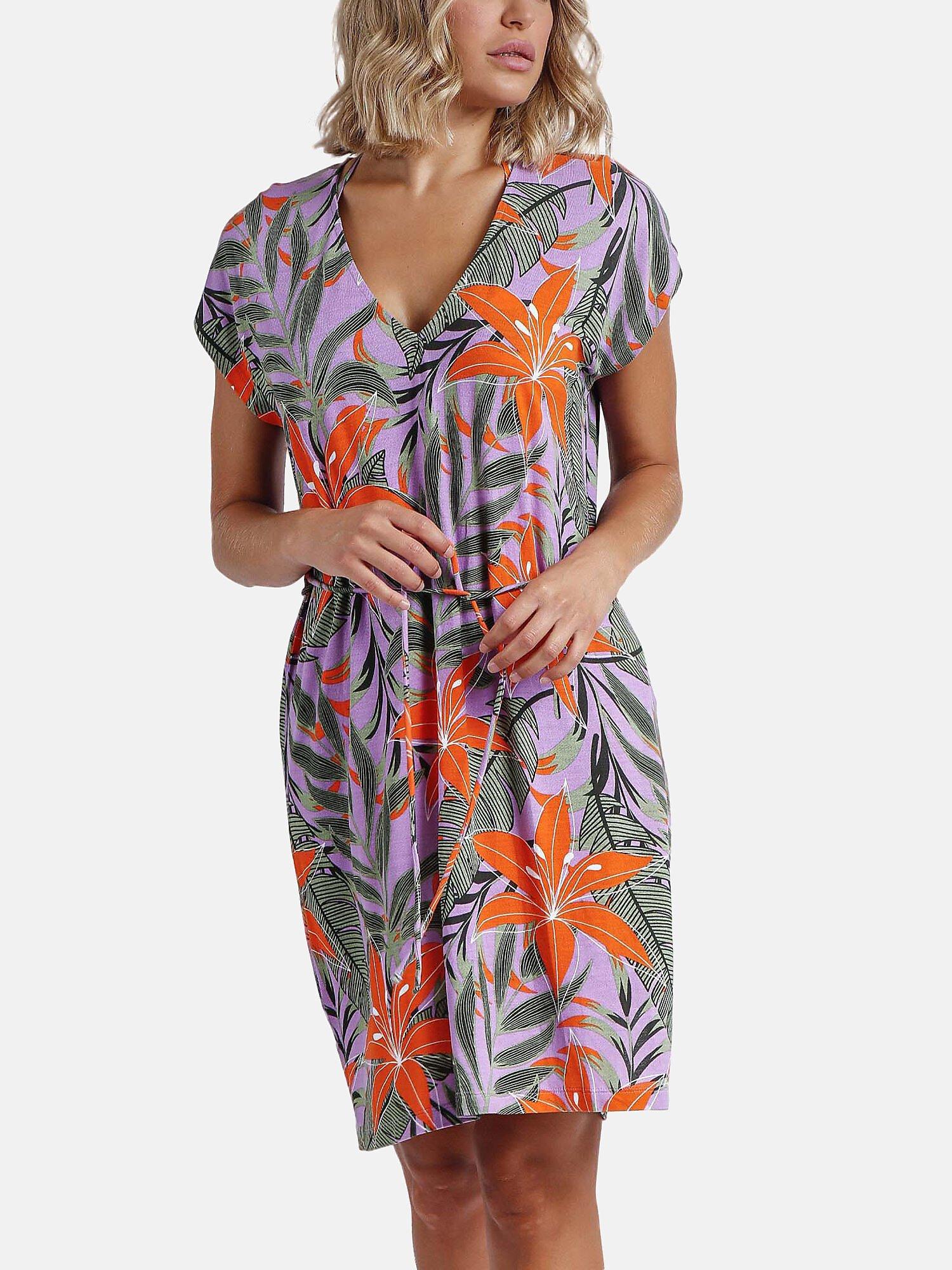 Dieses Sommerkleid von Admas ist vollständig aus fliessendem, leichtem Viskosegewebe gefertigt. Es ist perfekt für warme Sommertage in der Stadt oder am Strand geeignet. Mit seinem farbenfrohen tropischen Druck auf lilafarbenem Hintergrund verleiht es einen strahlenden Look. Das Kleid hat kurze Ärmel, einen V-Ausschnitt und einen schmalen Gürtel, der in der Taille gebunden werden kann, um die Silhouette zu betonen.