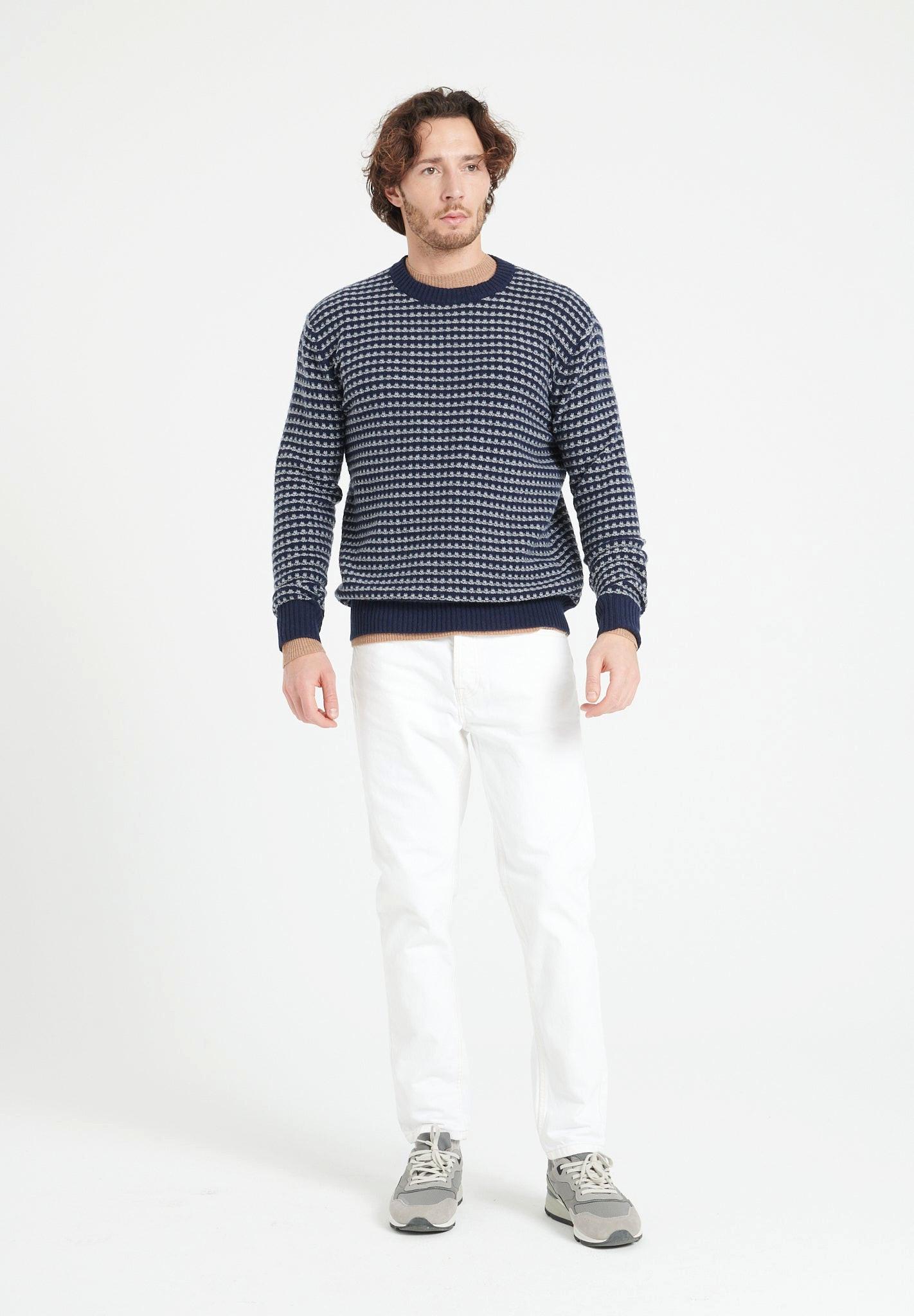 Dieser Rundhals-Pullover aus 4-fädigem Kaschmir ist aus weichem und warmem Kaschmir gefertigt und weist ein originelles Jacquardmuster auf. Er hat eine entspannte Passform und gerippte Abschlüsse. Dieses vielseitige Kleidungsstück kann mit Jeans oder Anzughosen getragen werden.