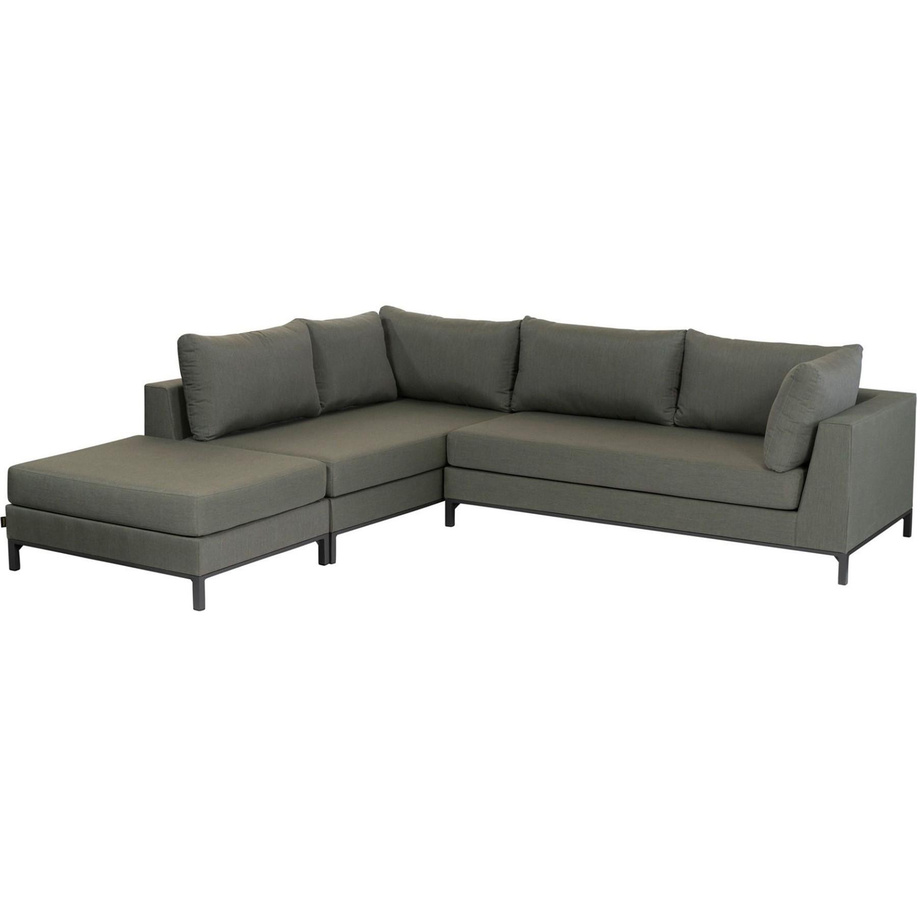 Lounge-Set für draussen Konstruiert mit einem Aluminiumrahmen Gepolstert mit einem geeigneten Outdoor-Stoff H 60 cm x B 262 cm x T 246 cm Machen Sie Ihre Terrasse oder Ihren Balkon mit diesem entspannenden Ecksofa fit für die langen Sommertage. Das Lounge-Set Capri von mutoni living sorgt dafür, dass Sie die endlosen Sommerabende geniessen können. Das Loungeset besteht aus vier verkettbaren Elementen. Aussenbereich Schützen Sie die Möbel vor starkem Regen, Nachtfrost und Winter mit einer Plastikfolie oder Schutzhülle. Wenn möglich, ist es besser, die Möbel drinnen zu überwintern. Material Die Nova Outdoor-Stoffe von mutoni living sind in Bezug auf Aussehen und Griffigkeit nicht von einem schicken Webstoff für den Innenbereich zu unterscheiden. Der gewebte Outdoor-Stoff besteht aus 100 % Solution Dyed Arcylic, einer nachhaltigen Art der Färbung des PolyesterMaterials durch den bewussten Einsatz von Wasser. Der leuchtende Farbton verleiht dem Bezug eine schöne, optische Tiefe. Abmessungen - Höhe: 60 cm - Breite: 262 cm - Tiefe: 246 cm - Belastbarkeit: 100 kg pro Sitz - Gewicht: 73,5 kg Pflege Der hochwertige Nova Outdoor-Stoff ist dank seiner speziellen Beschichtung sehr pflegeleicht; Wasser und flüssige Substanzen bleiben an der Oberfläche und ziehen nicht in den Stoff ein. Flecken lassen sich leicht mit warmem Wasser und neutraler Seife entfernen. Die Polsterung ist ausserdem UV-beständig, was ein Ausbleichen verhindert, so dass Sie die Möbel getrost die ganze Gartensaison über draussen stehen lassen können. Schutz Der Nova Outdoor-Stoff ist vollständig wasser- und schmutzabweisend und auch gegen Meer- und Chlorwasser beständig. Im Laufe der Zeit können Witterungseinflüsse ihre Spuren auf dem Stoff hinterlassen. Wenn Sie den Stoff anschliessend erneut imprägnieren, erhält das Nova Outdoor-Stoff einen zusätzlichen UV-Filter und eine schmutzabweisende Beschichtu