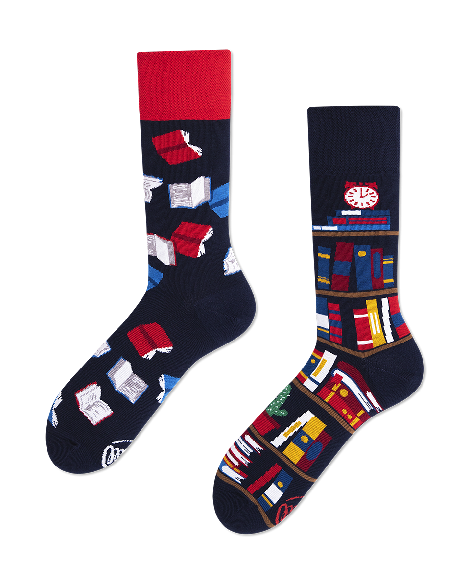 Diese Socken zeichnen sich durch ein verspieltes und einzigartiges Design aus, das jedem Outfit eine persönliche Note verleiht. Eine Socke zeigt eine Reihe offener und geschlossener Bücher, während die andere ein detailliertes Bücherregal mit Büchern und einer Uhr darstellt. Die kontrastierenden Designs auf jeder Socke sorgen für einen lustigen und ungleichen Look.