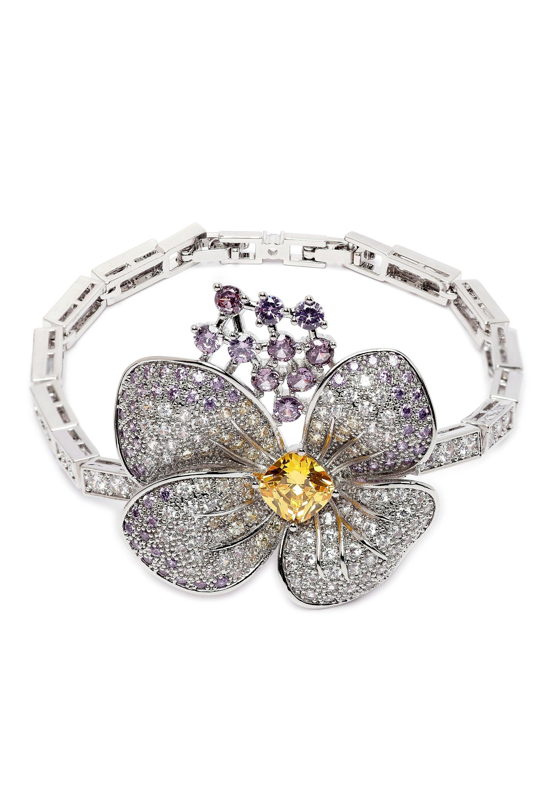 Das Diva Floral Armband aus der Diva Kollektion ist ein exquisites und einzigartiges Armband mit einem atemberaubenden floralen Design und Zirkonia-Steinen. Das zentrale Motiv jedes Armbands ist eine große Blüte mit gelber Mitte, umgeben von zarten, herabhängenden Blüten. Dieses Set enthält ein Armband mit lila Blüten. Ob einzeln oder als Set getragen – diese Armbänder setzen ein modisches Statement und unterstreichen Ihren Stil. Größe: 3,9 cm x 17,0 cm | Beschichtung: Rhodiumplattiert | Verschluss: Karabinerverschluss