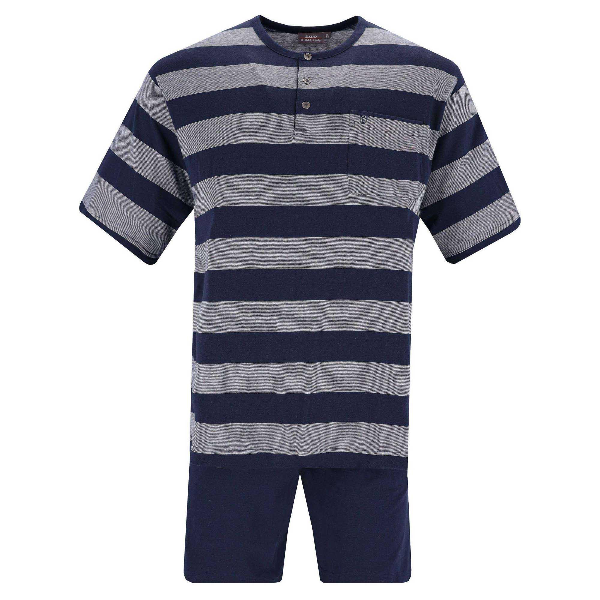 Dieses bequeme Pyjama-Set besteht aus einem geringelten Kurzarm-Oberteil und einer einfarbigen kurzen Hose, die für eine entspannte Passform konzipiert sind. Das Oberteil verfügt über einen Henley-Ausschnitt mit Knopfverschluss und eine Brusttasche, die diesem Schlafanzug-Ensemble einen klassischen Touch verleiht.