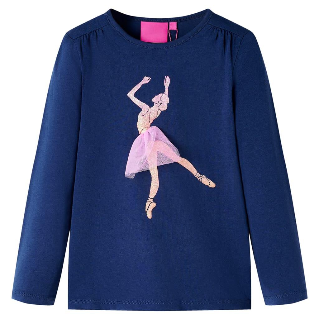 Dieses Kinder-T-Shirt hat lange Ärmel, einen Rundhalsausschnitt und eine gerade Passform. Das marineblaue T-Shirt ist mit einer glänzenden Ballerina mit Tüllrock bedruckt. Das Langarmshirt ist aus weichem Material gefertigt, das zu 95 % aus Baumwolle und zu 5 % aus Elastan besteht und daher nicht nur äußerst komfortabel, sondern auch atmungsaktiv ist.